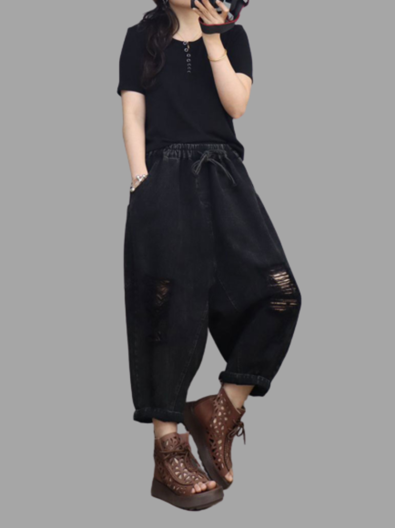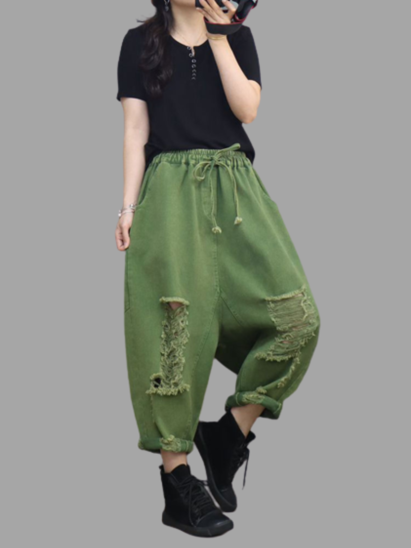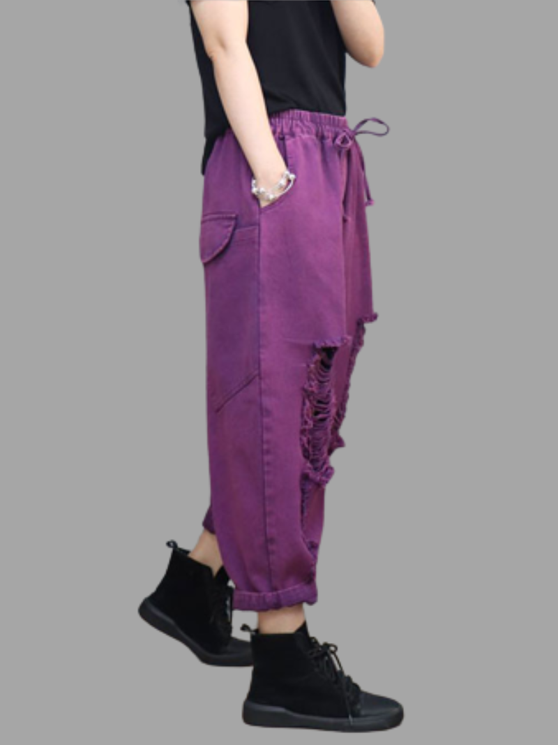 These baggy pants are made of denim and are available in five different colors - red. black. purple. green. and beige. The pants have a natural waist. providing a comfortable fit for the wearer. Their loose and relaxed style gives a trendy and casual vibe. making them perfect for everyday wear. The pants have a nine-pant length. which falls just above the ankle. adding a touch of uniqueness to the design. The high-quality denim material ensures durability and breathability. making these pants ideal for all seasons. These baggy pants are a versatile piece that can be paired with a variety of tops and accessories. making them a great addition to any wardrobe.