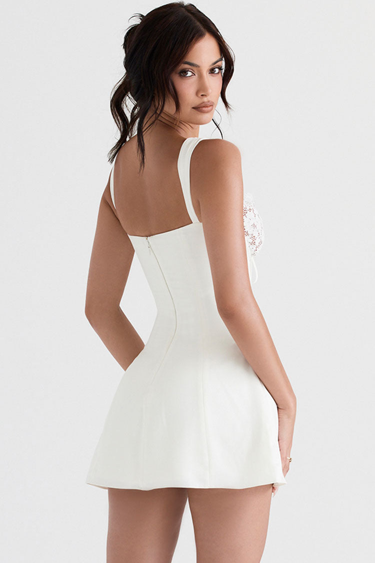Let's keep it short and feminine: polished little white satin dresses are ideal that's sophisticated and seductive in all the best ways. A simple summer sundress—with contrast floral lace detail at the chest—feels apropos & fresh for parties and vacations. Designed with a daring sweetheart neckline in a sweet way. suspender shoulder straps. a bow-tie in the middle adding fun. a fluid tank silhouette with a hidden back zipper in a slightly flared short dress cut. this breezy sleeveless mini dress in our boutique is suited for women wants to feel without showing too much skin. Style this French style dance outfit with stiletto heels.