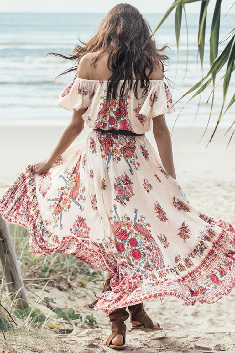 Keep the boho trends with flowing maxi dresses. This floral print off shoulder cutout high low boho style maxi dress is a new go-to maxi for you. Finished with an off-the-shoulder neckline. simple short sleeves. cut out trim at waist with a drawstring tie. fabulous floral prints throughout. and flowy asymmetric hem. this vacation-ready boutique dress for women create a sweet romantic look in summer. Wear this boho chic outfit with slides for your choice to complete a relaxed look.
