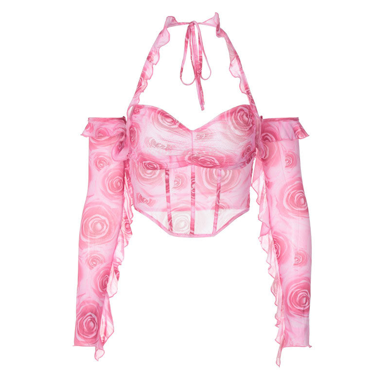 This feminine long-sleeve top will be the perfect pick for the days when you want to have a chic look! Crafted with polyester. embellished with a cold-shoulder design along with fitted sleeves. featuring a halter neckline accented with gathered charms. a corseted bodice framed with sculptural bones. a fitted silhouette adorned with frilled accents and a curved hem. Find more trendy women's corset tops or unique clothing in our boutique. and complete a sexy look with a mini skirt.