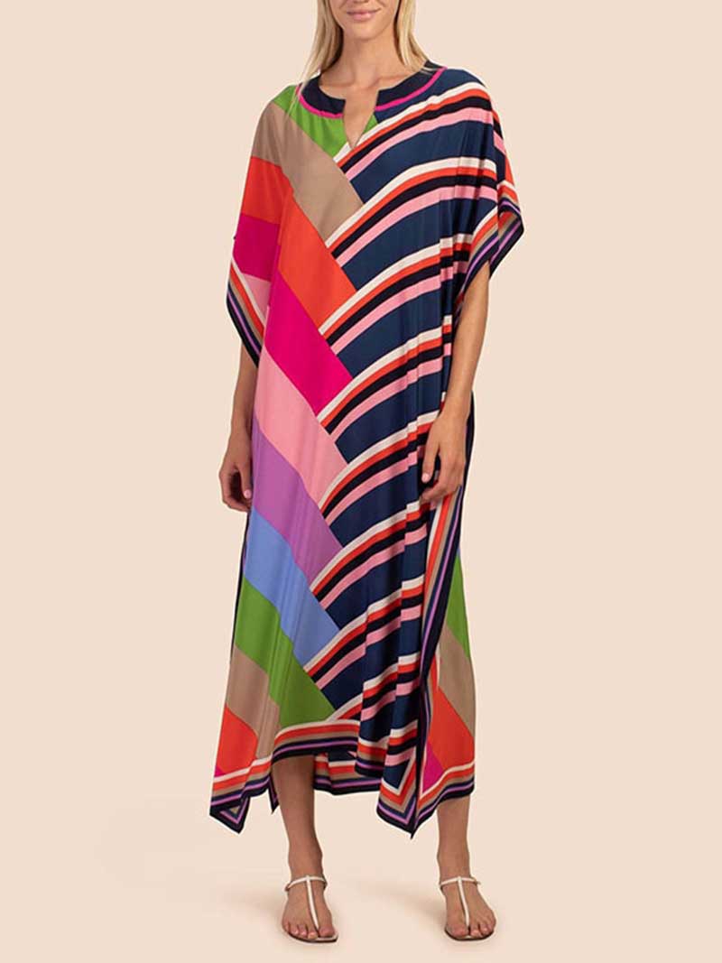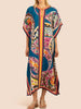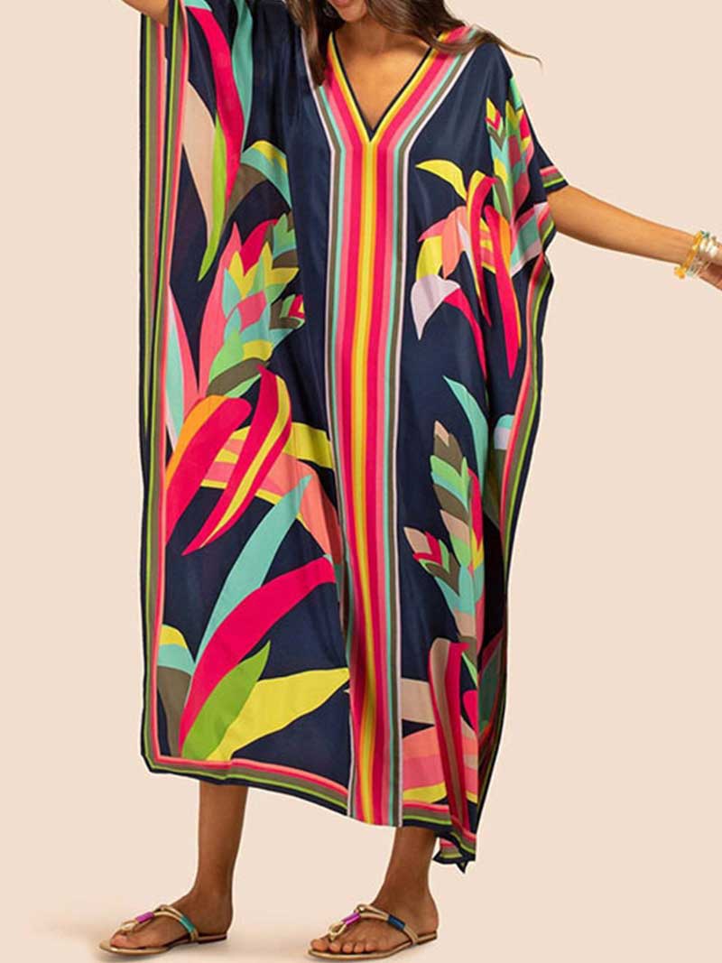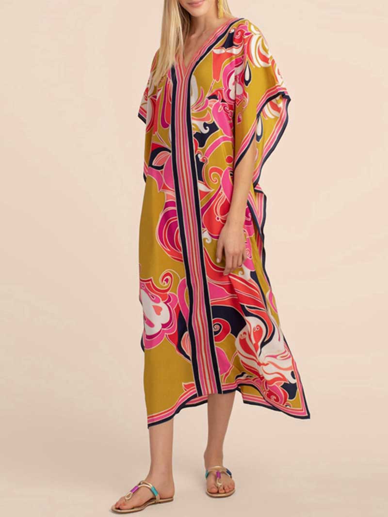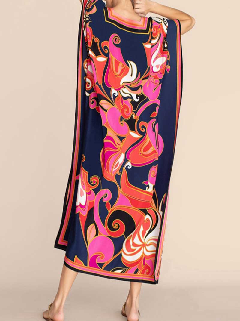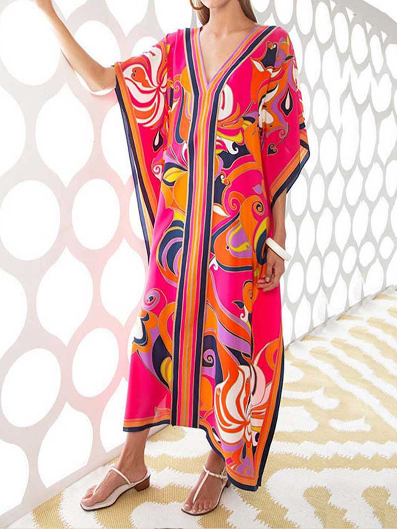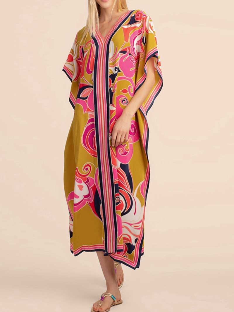 Short sleeves and a V-neck make this kaftan dress extremely flattering. while the loose-fitting silhouette means it's comfortable to wear all day long. The tasteful floral print is perfect for spring and summer. not to mention that it comes in a range of colors to suit any taste. Whether you're looking for something to wear on vacation or just wanting a pretty dress to throw on for a weekend BBQ. this is a perfect choice.