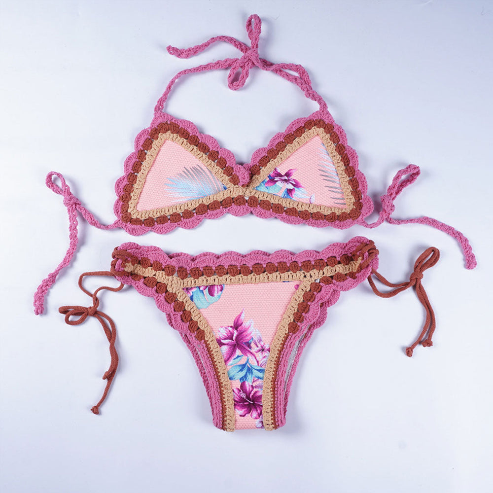 This bohemian style two-piece swimsuit in pastel color flowers is a sexy piece for your sunny beach days. Made from stretchy knitted and spandex. embellished with scalloped crocheting banding. featuring a triangle top with thick cups. a halter tie along with a back tie for a conform fit. complete a trendy boho look with a pair of low rise bikini bottom tailored with cheeky back coverage and tied strings to the sides. Find more boutique women's bikini sets or unique swimwear to boast a brightly boho beach getaway.