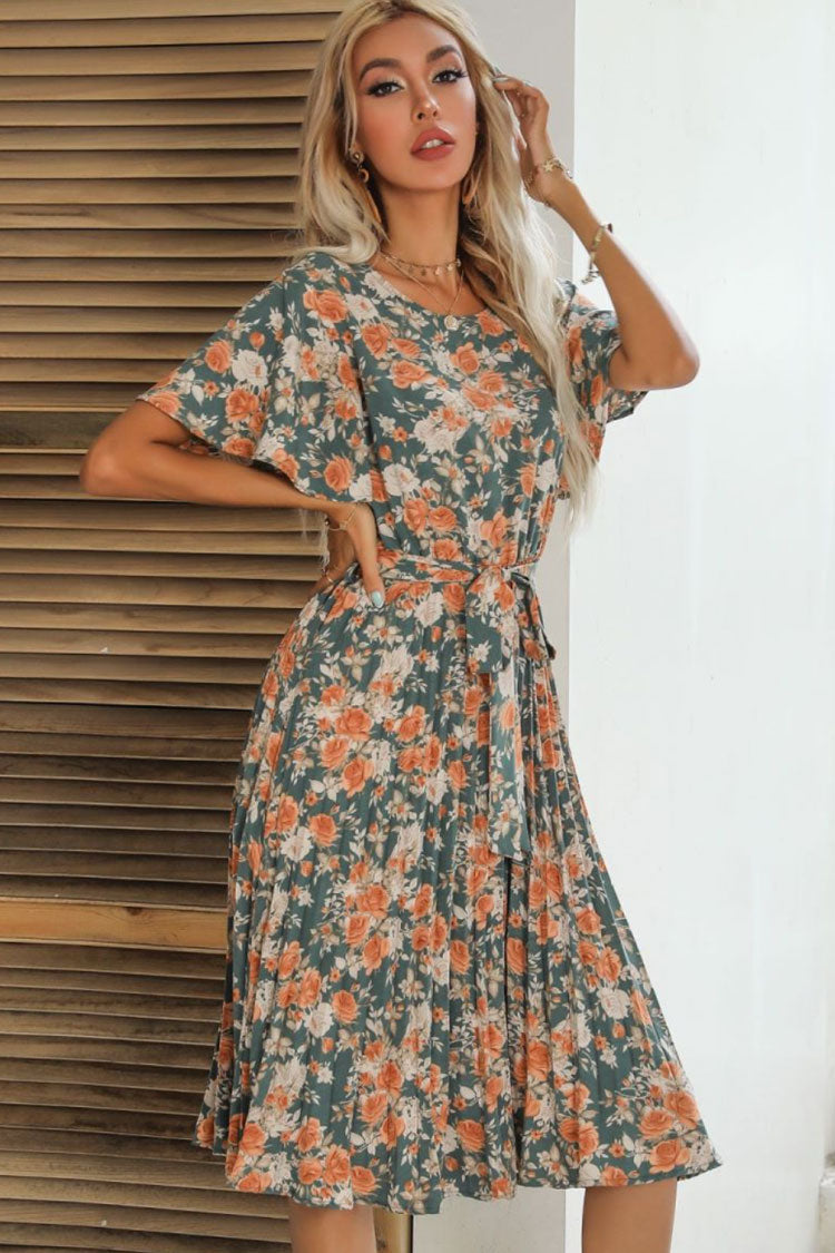 Fabulous floral dresses are so irresistible for women. Made of lightweight polyester with retro style floral patterns. this romantic floral midi dress in our boutique has a daytime garden party feel. with a simple round neckline. swingy short sleeves. a belt cinching at the waist. pleats at the skirt portion. and a fluid tea length dress cut for wearing with sneakers and sandal heels alike. Plant at least one floral midi in your closet for an elegant outing.