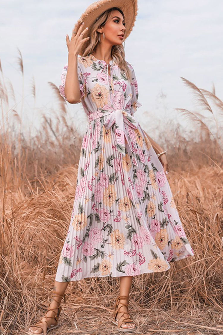 Beautiful floral dresses are so irresistible for women. Made of lightweight polyester with blooming floral patterns. this romantic floral midi dress in our boutique has a daytime garden party feel. Designed with a ruffle round neckline followed by a self-tie closure in the middle front. puffy short sleeves with elasticated cuffs. a belt cinching at the waist. pleats at the skirt portion. and a fluid tea length dress cut. this breezy beach vacation dress will keep you cool all summer - and the right hemline is perfect for wearing with sneakers and sandal heels alike.