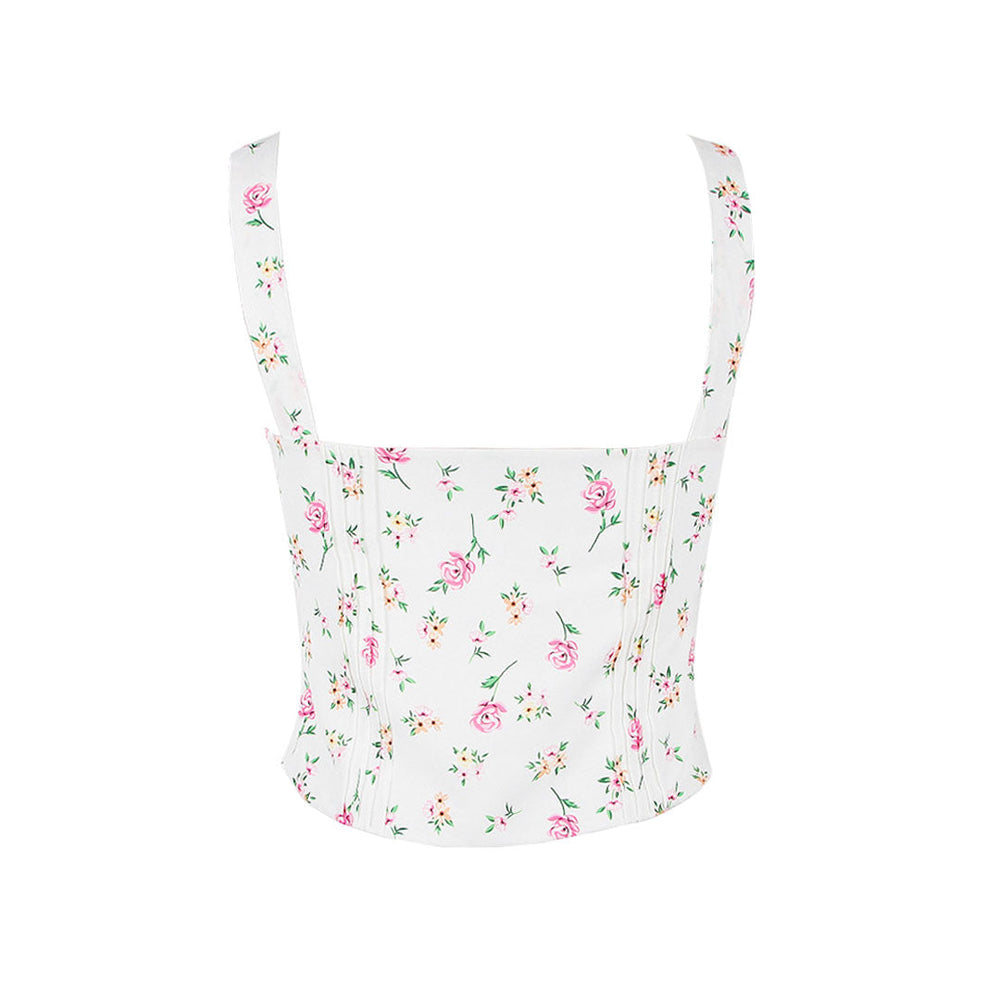 No summer without floral prints. walking in romance. This fresh floral print top features vertical pleat trim that add a touch of uniqueness. while the ruched details and drawstring square neckline add a flirty and feminine charm. The trend sleeveless bustier design enhances your figure. The eye fasteners at the front allow you to wear it as open as you dare. adding a hint of seductiveness to your ensemble. With full lining for a smooth and polished feel. this ditsy floral tank top is perfect for creating a garden party outfit.