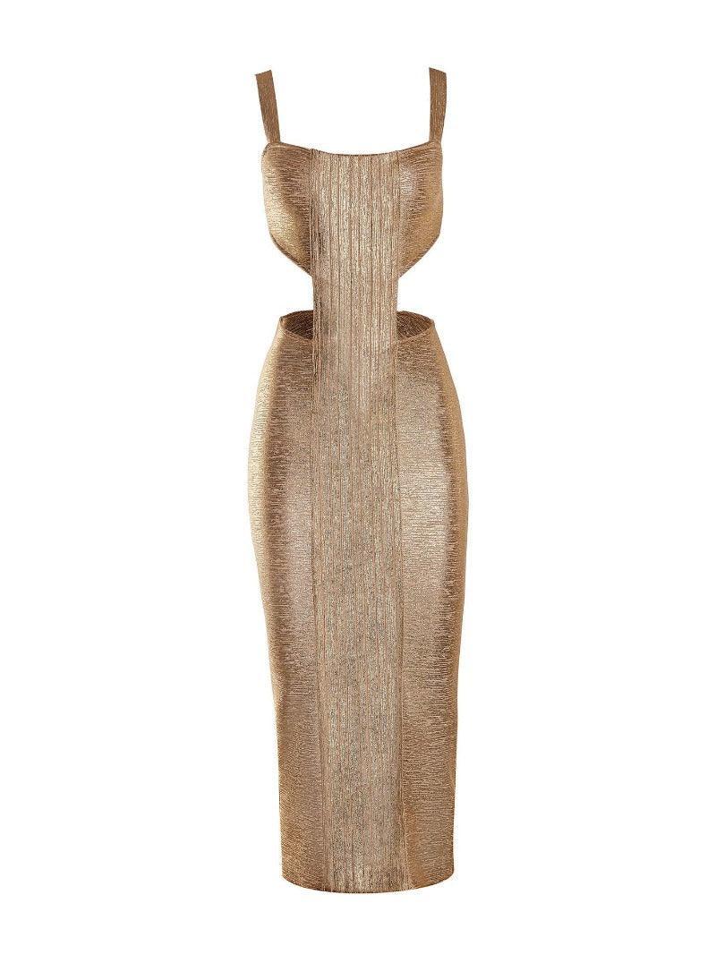 All eyes will be on you in the Freya Metallic Gold Dress. This bandage dress holds onto a sense of glamour with its metallic gold bandage fabric. open back. and classic square neckline. This maxi dress sculpts the figure's natural curves and opens up in the back for a sensual appeal.