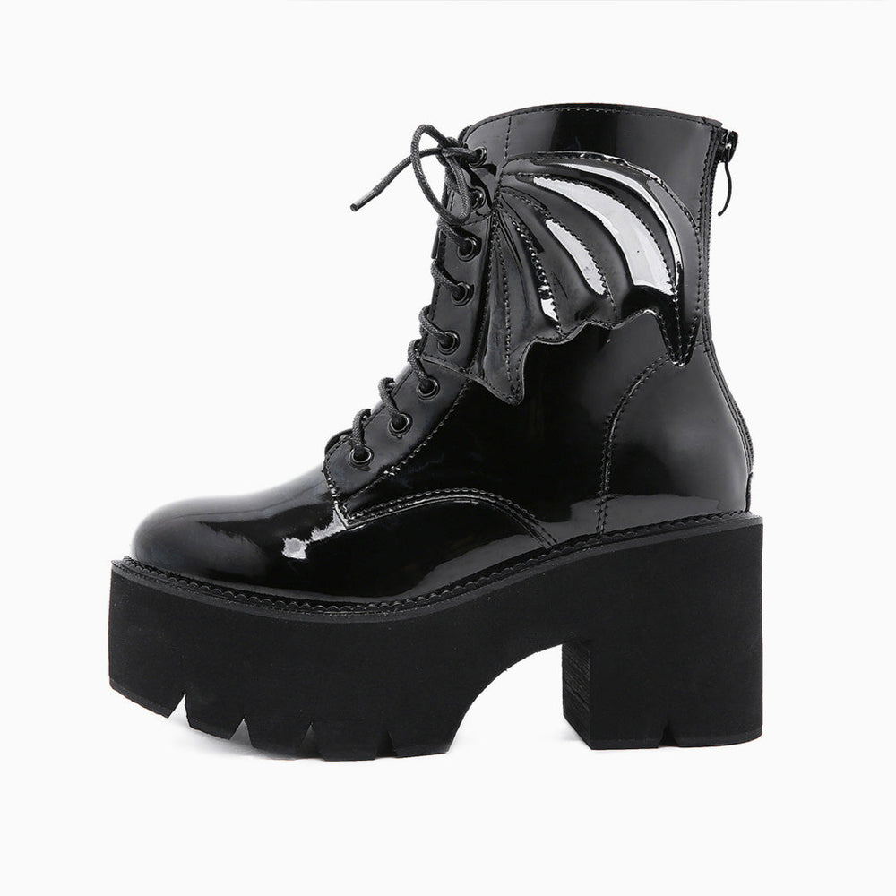 This pair of ankle boots adds a fun take to the classic block heel styling. Crafted with PU leather and rubber. embellished with flying wings to the sides. featuring an ankle-height topline tailored with a zip fastening to the rear. a round toe styling along with lace-up closure at the vamp. and grounded on extra thick. serrated lug rubber soles. Find more trendy women's boots and unique shoes in our boutique. and go with crop-length jeans or skirts for a funny look- Heel height: 8.5 cm.