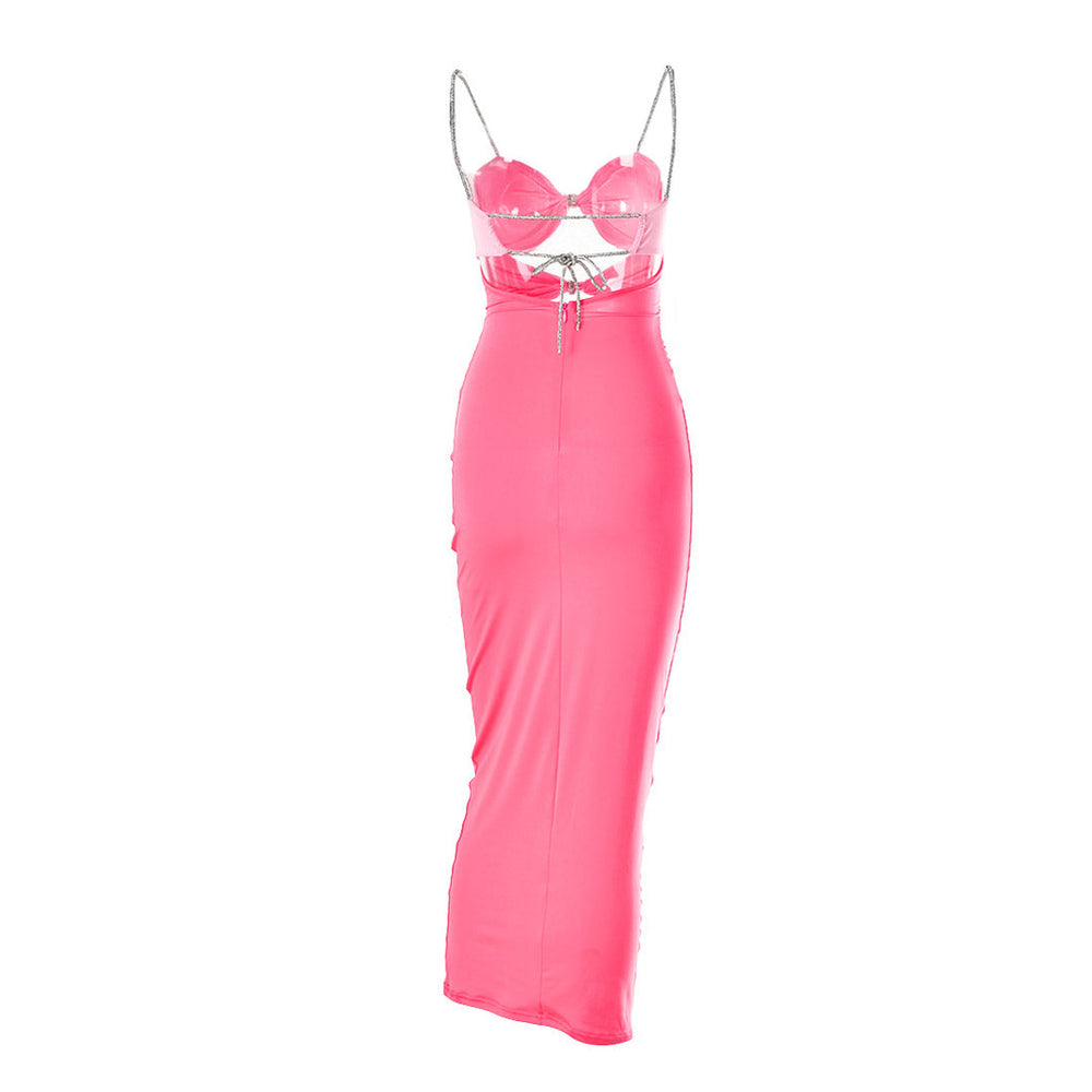 Be the star of the party in this contrast color maxi dress featuring sparkling crystal spaghetti straps. This sexy dress also boasts cutout detail at the center front under the bust area with unique fixed knot detailing. making it perfect for women who love to make a statement. The low back design with a lace-up detail adds a touch of boldness to the bodycon fit. creating a stunning silhouette. The pull-on construction allows for easy slip-in. and the chest lining ensures that the polyester fabric is not sheer. so you don't have to worry about showing too much. To create a trend look. pair this dress with our shimmery bag that will complement the sparkle of the dress. Get ready to dance the night away in this stunning maxi dress that is sure to turn heads.