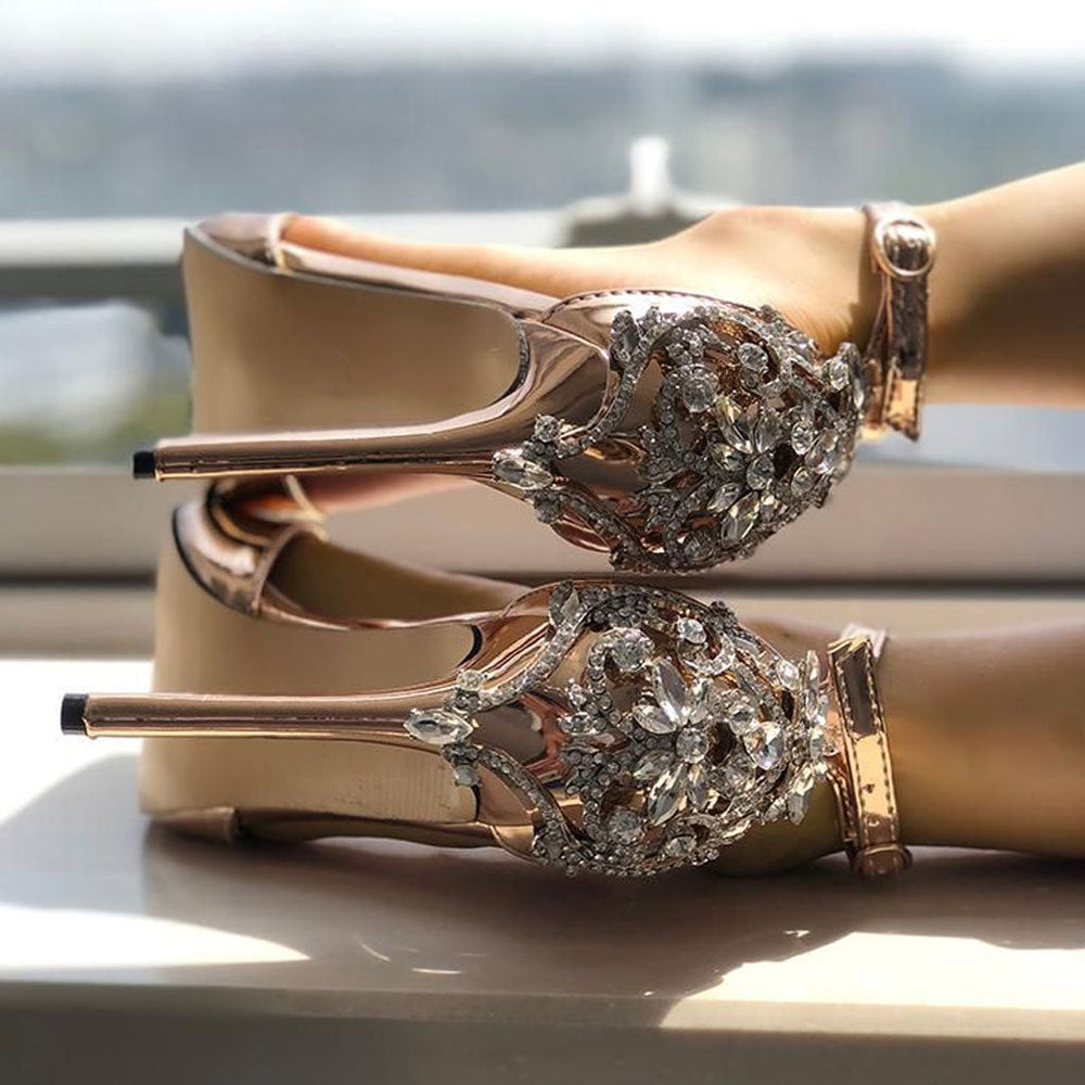 A little glitter never hurt anybody. Crafted with polished satin. faux leather and rubber. embellished with glittering rhinestone at the back. featuring a pointed peep toe at the front. lightly cushioned footbed. an ankle strap with buckle fastening. a sky-high heel. and finished with rubber heel cap. Find more unique women's sandals and trendy shoes in our boutique. and style it with everything for a glamour look- Heel height: 11.5 cm.