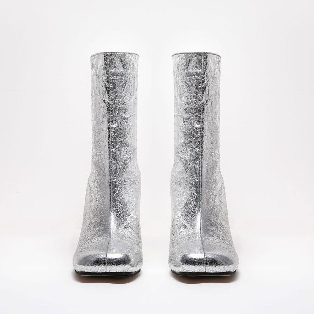Make everyone swoon over you while you wear the mirror boots. Made of PU leather and rubber. embellished with a technical polished effect. featuring a square toe emphasized by a textured buffed upper. synthetic cushioned footbed. a relaxed shaft silhouette trimmed with crease effects. a slip-on styling anchored by a kitten high heel and a rubber heel cap. Find more trendy women's kitten-heel boots and unique shoes in our boutique. and try them on with a sequin mini dress and a statement necklace - Heel height: 9cm.
