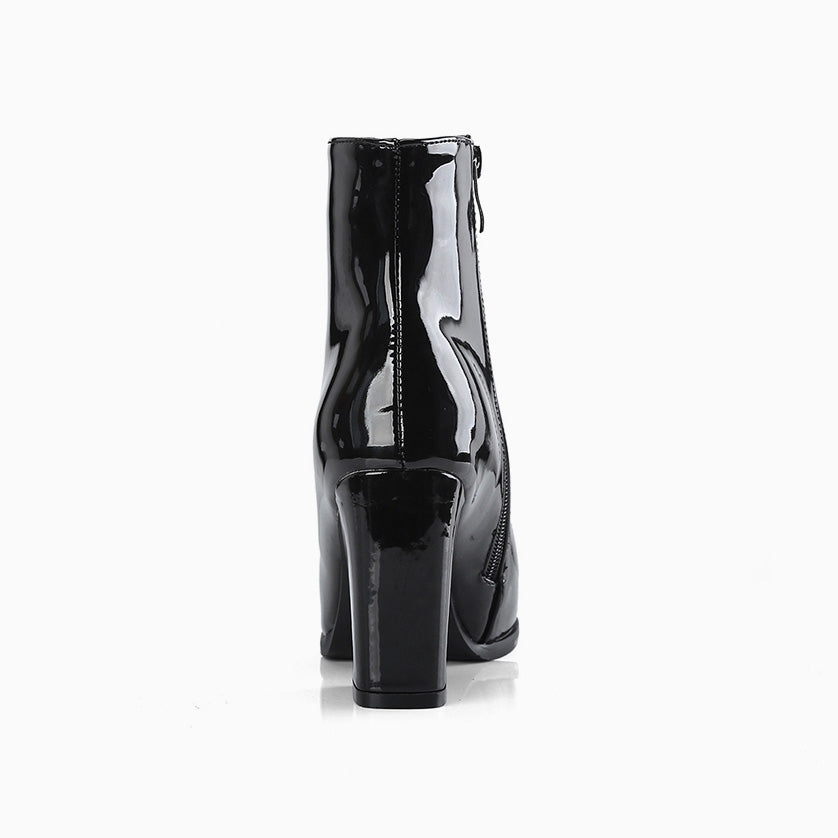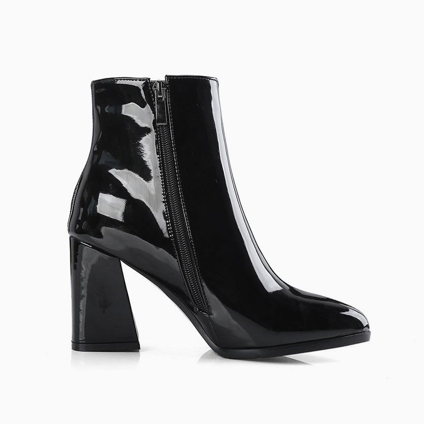 This pair of ankle boots adds a cool touch to your everyday wear. Crafted with PU enamel leather and rubber. stand out in high-shine vamp. featuring an ankle-height topline with zip fastening to one side. sharp pointed toes to the front. chunky heel along with rubber heel cap. and an anti-slip rubber outsole. Find more trendy women's boots and unique shoes in our boutique. and pair the stylish boots with everything from cropped denim to dresses and skirts for a modern chic street look- Heel height: 8 cm.