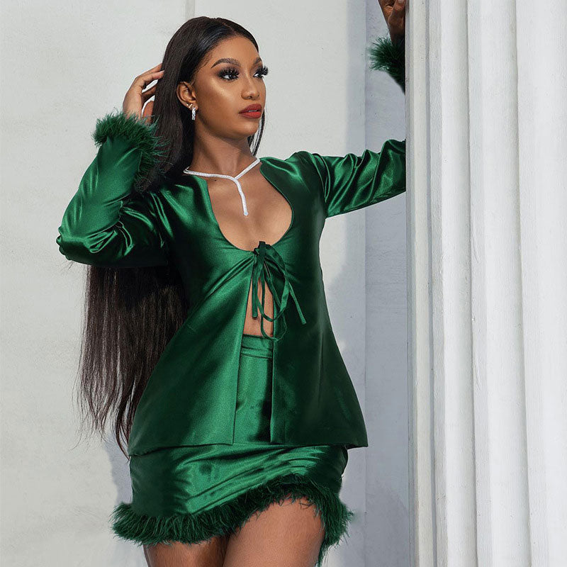 Mesmerize everyone in this charming sheen skirt matching set. Made of polyester and elastane. embellished with plumped imitated feather. featuring an open front trimmed with tying strings and a sexy slit effect. long sleeves embodied with fluffy details at cuffs. and complete a minimalist two piece set with a slim-fit mini skirt and fancy darts. a pullover styling structured with a concealed back zipper. ending up with a short length. Find more unique women's solid-color matching sets or trendy clothing in our boutique. and team it with a sparkly necklace and a chain bag for a sumptuous look.
