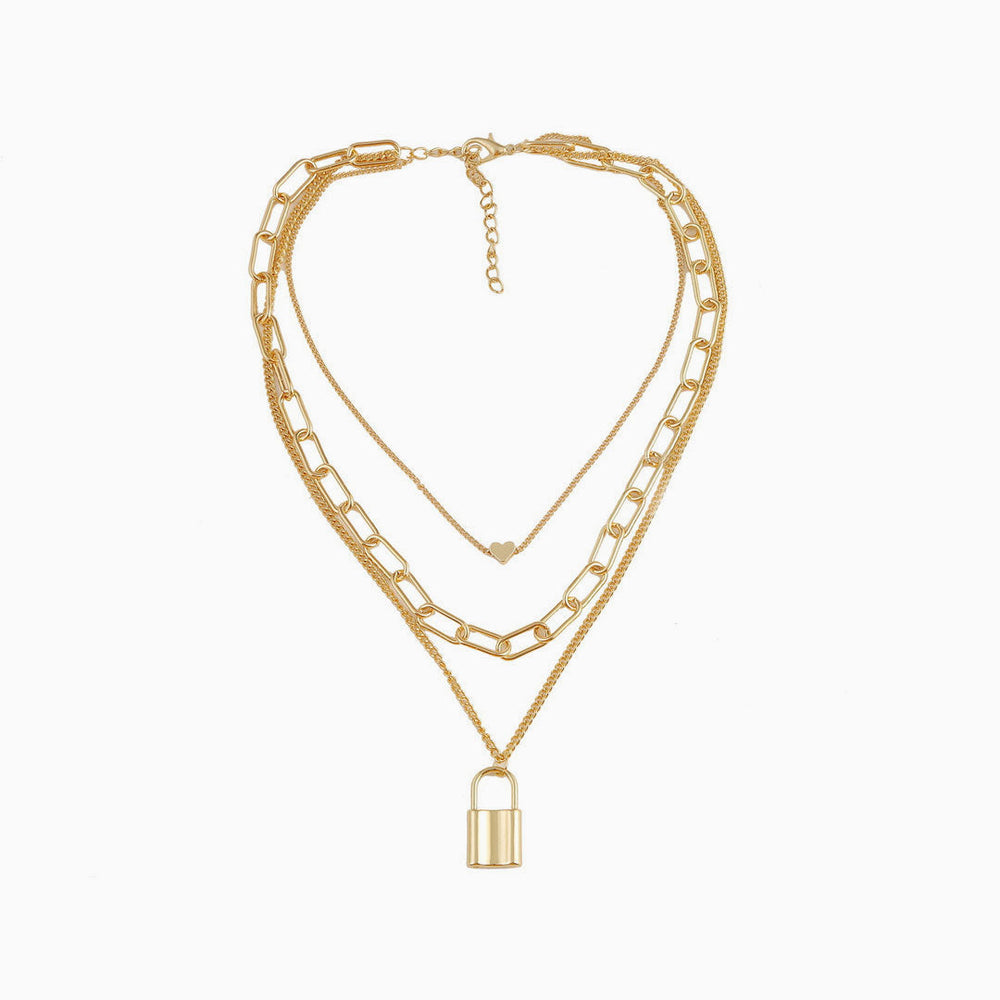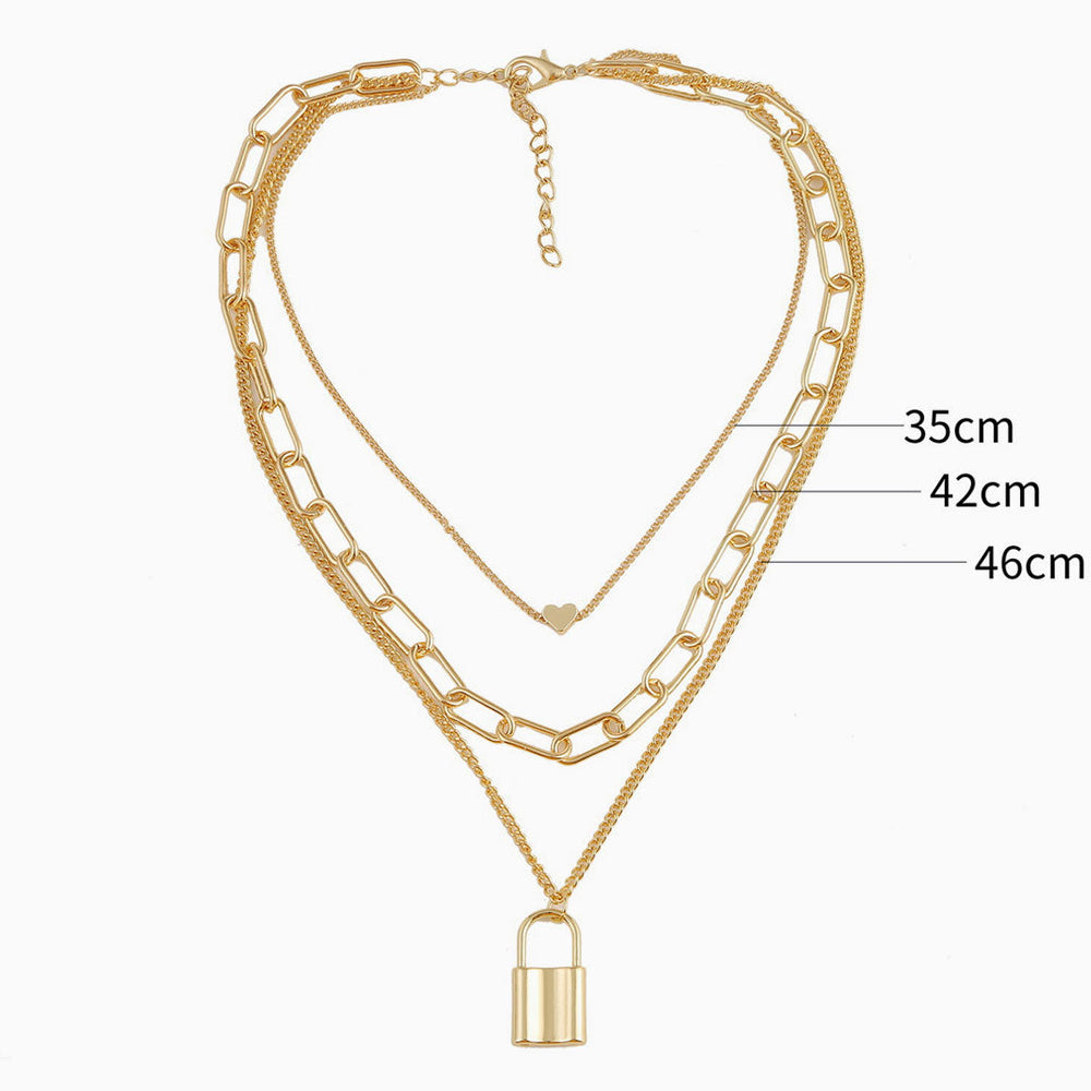This chain necklace is a bold statement piece for your collection. Crafted with gold plated alloy. stand out in three strand necklace presented in gold tone. featuring chain-link styling decorated with a heart pendant and a lock pendant to the center front. along with an adjustable fit and finished with a spring-ring fastening. Find more unique women's necklaces and boutique Jewelry. and layer it over a turtleneck top for a trendy modern look.