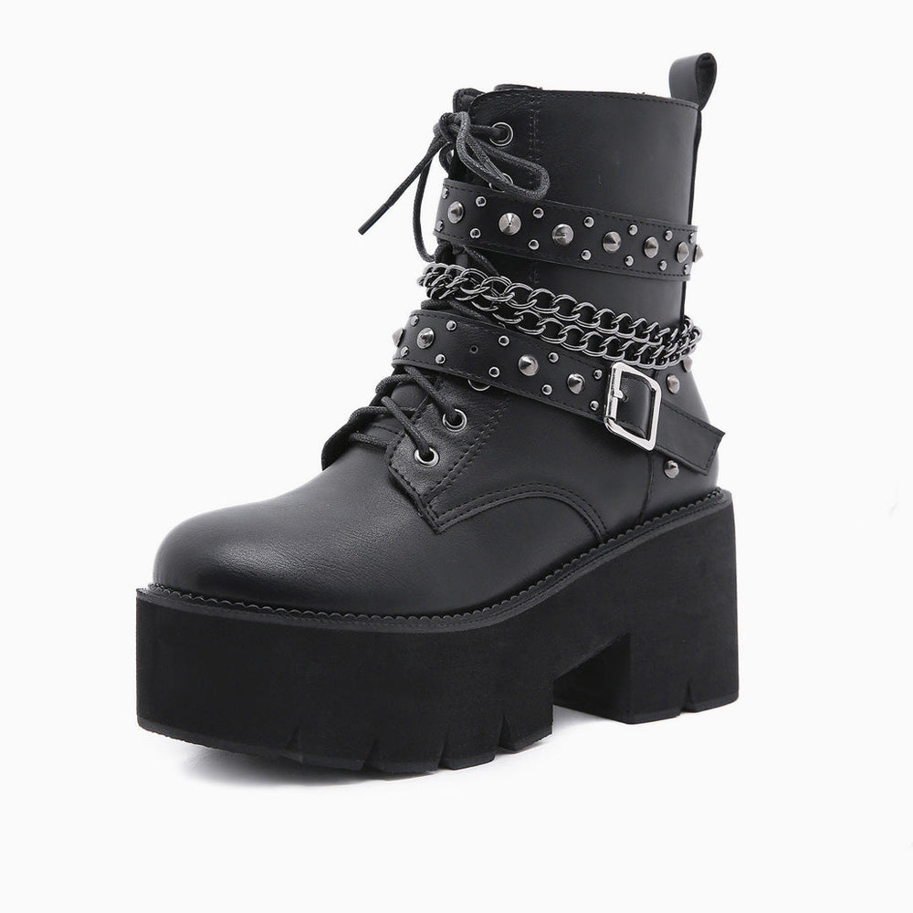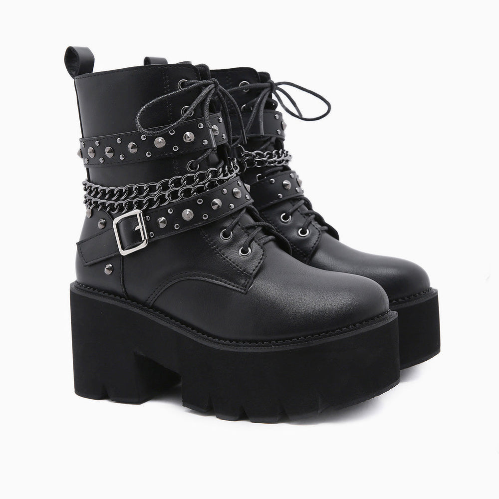 This pair of stylish boots strikes a rock-and-roll touch to your simple wintertime. Crafted with PU leather and rubber. embellished with silver rivets straps and decorative metal chains. featuring an ankle-height topline presented in solid black. lace-up detailing at the vamp trimmed with a zipped fastening to one side. round toe styling. and grounded on extra thick. serrated lug rubber soles. Find more unique women's boots and trendy shoes in our boutique. and don bright dresses with them for a cool street look- Heel height: 8cm.