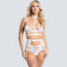The strappy design and lace detailing adds a touch of elegance and femininity to the set. while the garter belt adds a hint of sexiness.