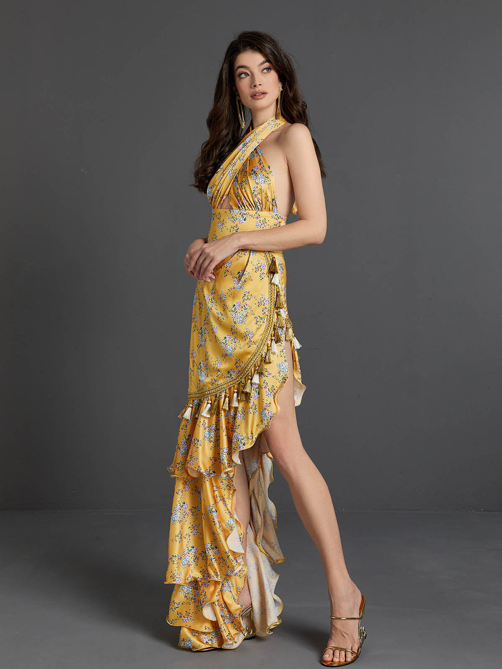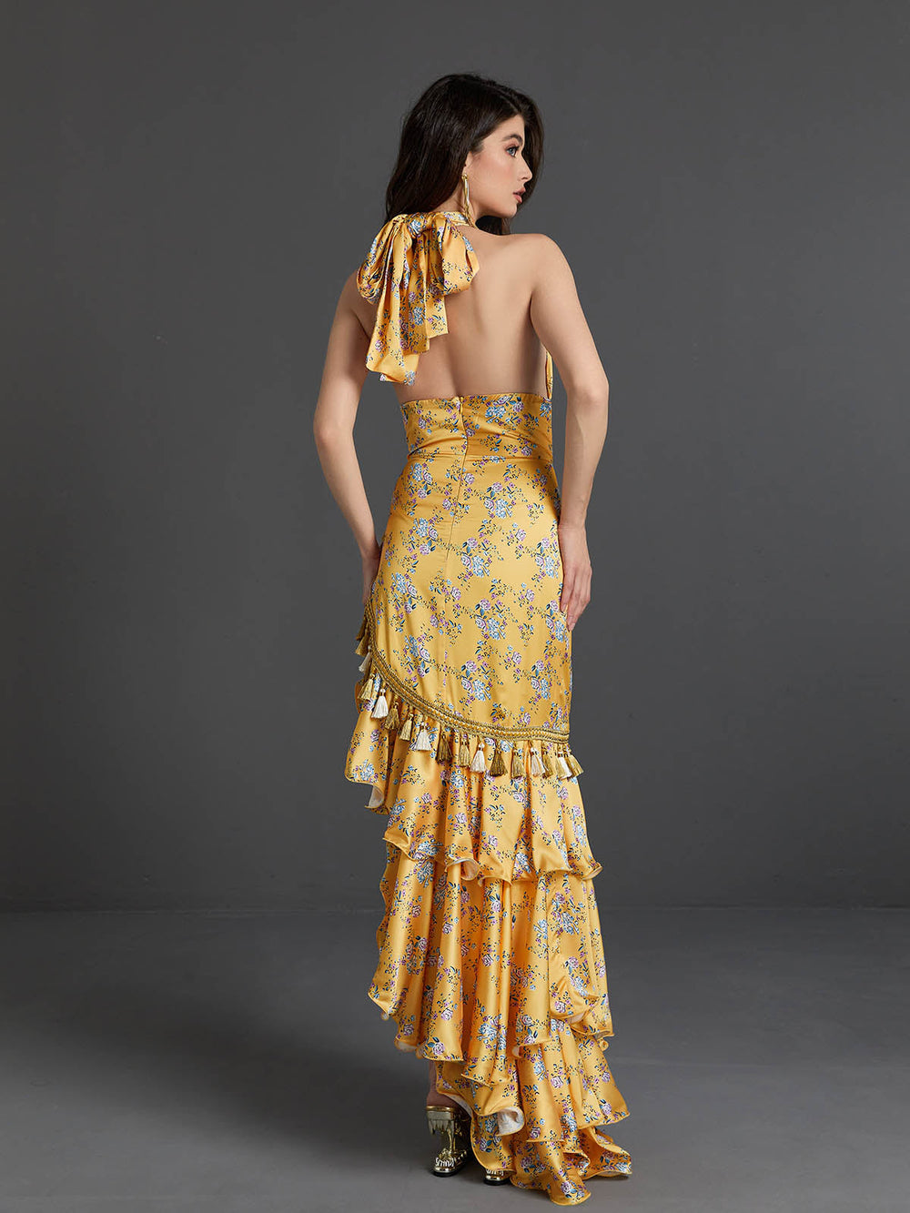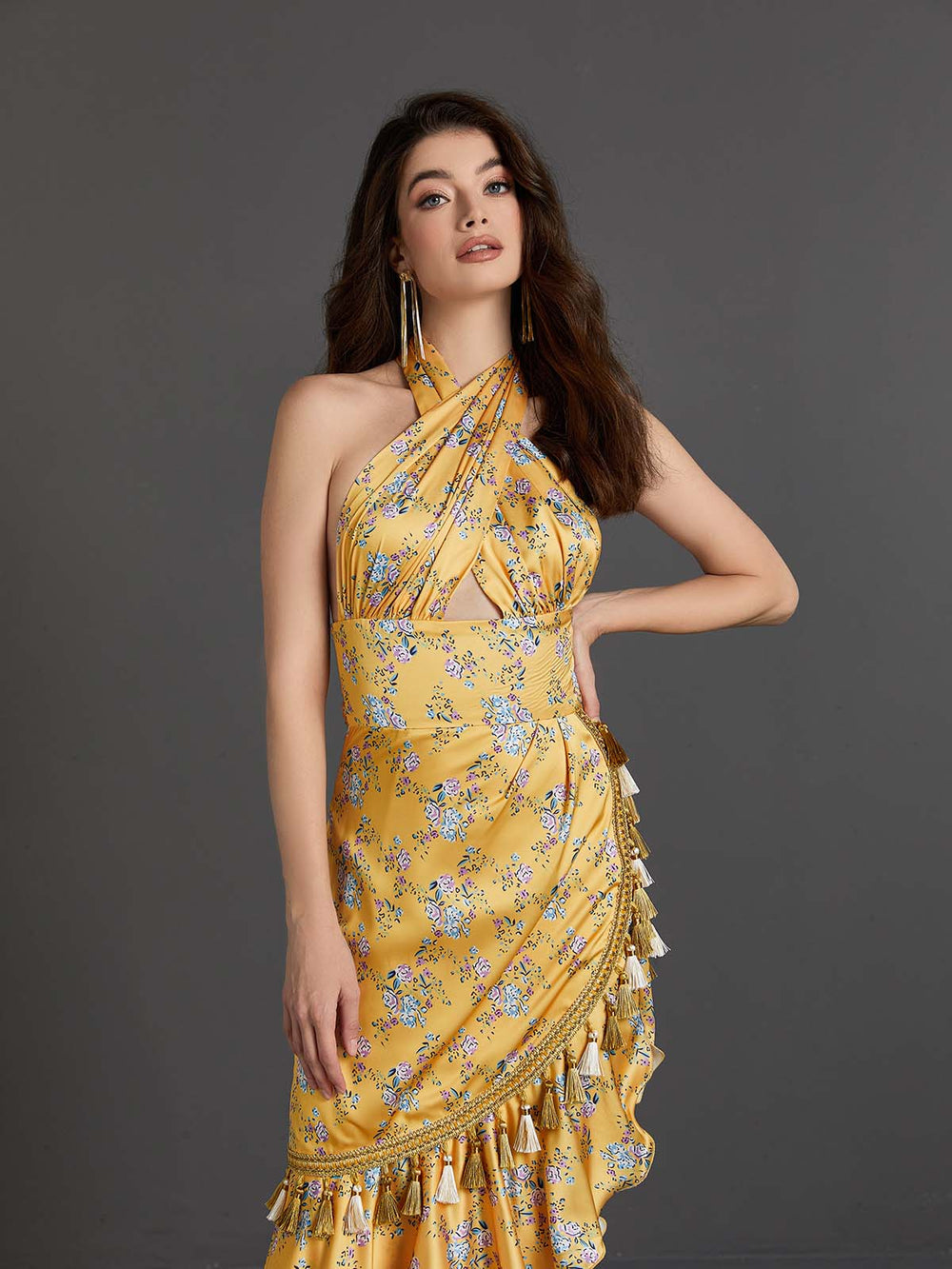 This Levana Halterneck Floral Maxi Dress is perfect for formal occasions. Its halterneck design. maxi length and asymmetric hem provide a striking silhouette. while the floral pattern adds a touch of understated elegance. An excellent choice for any special event.