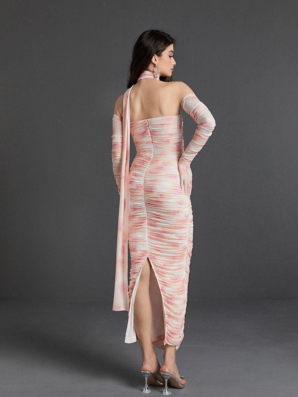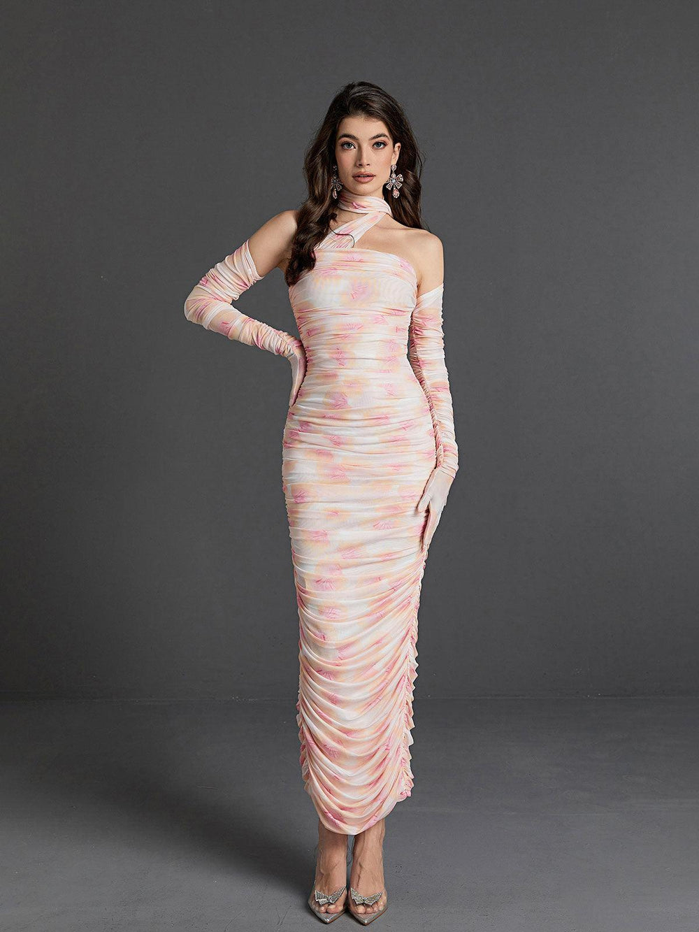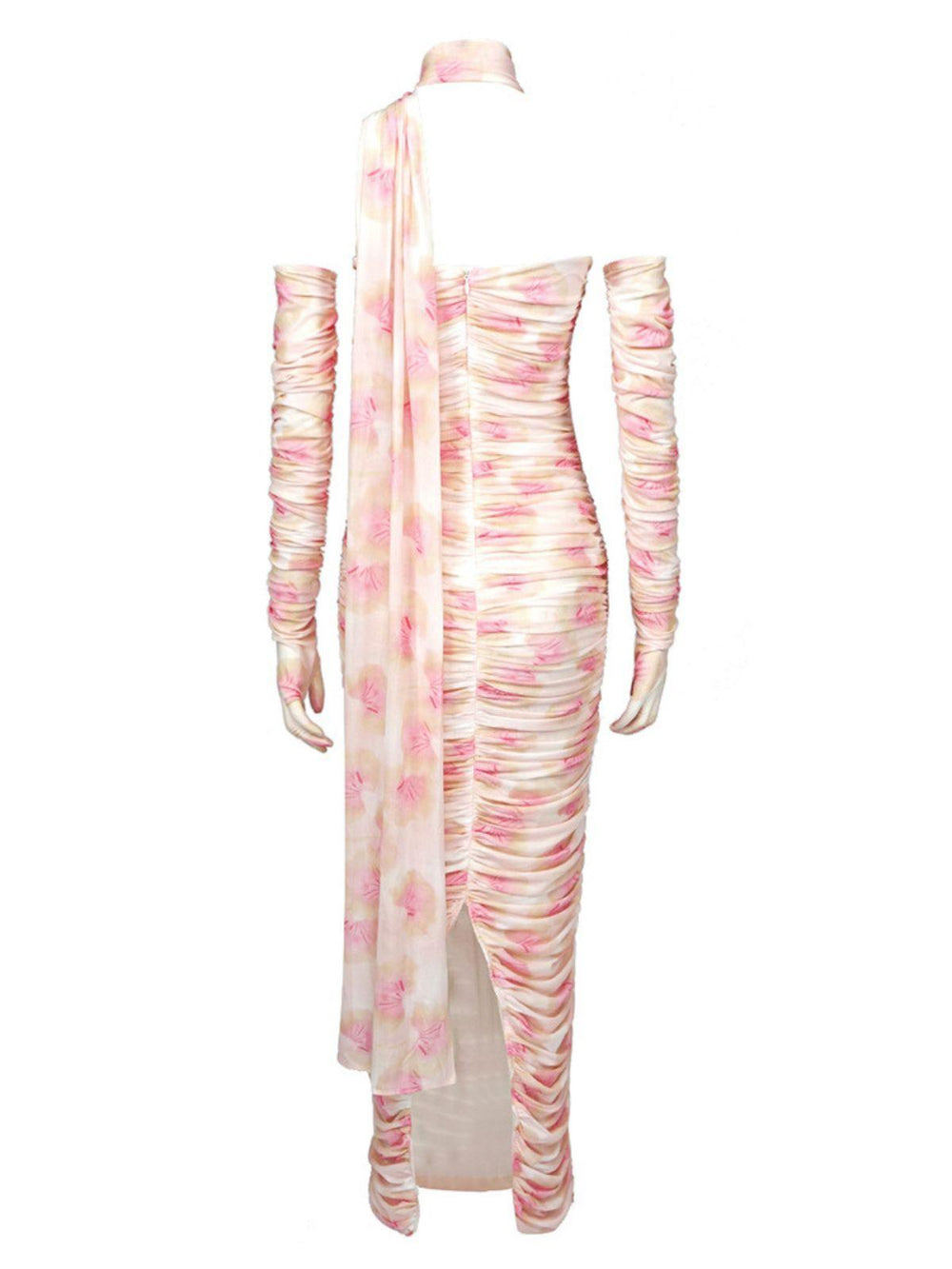 Exquisite and timeless. the Livana Floral Mesh Maxi Dress will lend sophistication to any wardrobe. Crafted from a lightweight mesh fabric with beautiful floral print. the dress features a halterneck. ruched bodice. and split at the back. Complete with a midi length and included gloves. this dress is the perfect piece for any fashionable occasion.