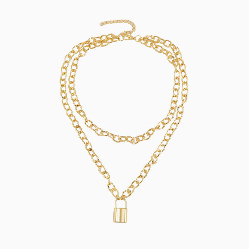 This layered necklace is the ideal statement piece for your collection. Crafted with gold plated alloy. stand out in a gold-tone lock pendant to the center front. featuring two strand necklace structured with oval shape. along with an adjustable fit and finished with a spring-ring fastening. Find more unique women's necklaces andour boutique jewelry. and layer it over a turtleneck top for a trendy punk look.