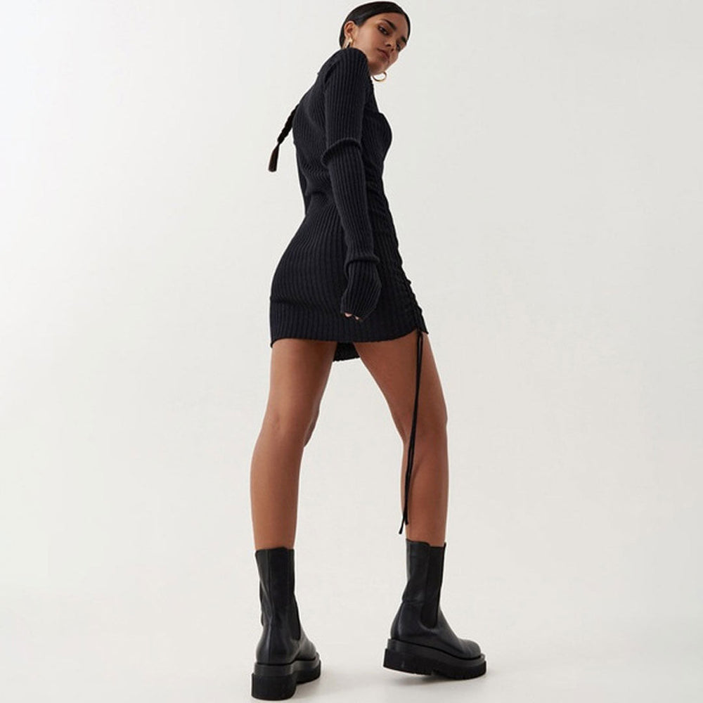 Enhance your natural beauty in this rib dress that gives you warm and glamor this fall. Crafted with polyester. stand out in a drawstring design on one side. featuring a high neckline. elongated long sleeves adorned with thumb holes. a bodycon profile and a pullover styling ended up with a short length. Find more trendy women's short dresses or unique clothing in our boutique. and wear this solid dress with a vintage jacket to finish your classic look!
