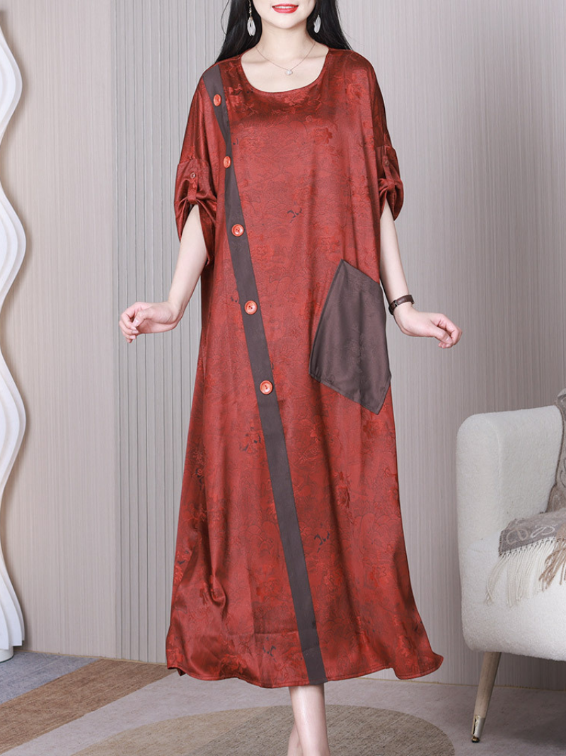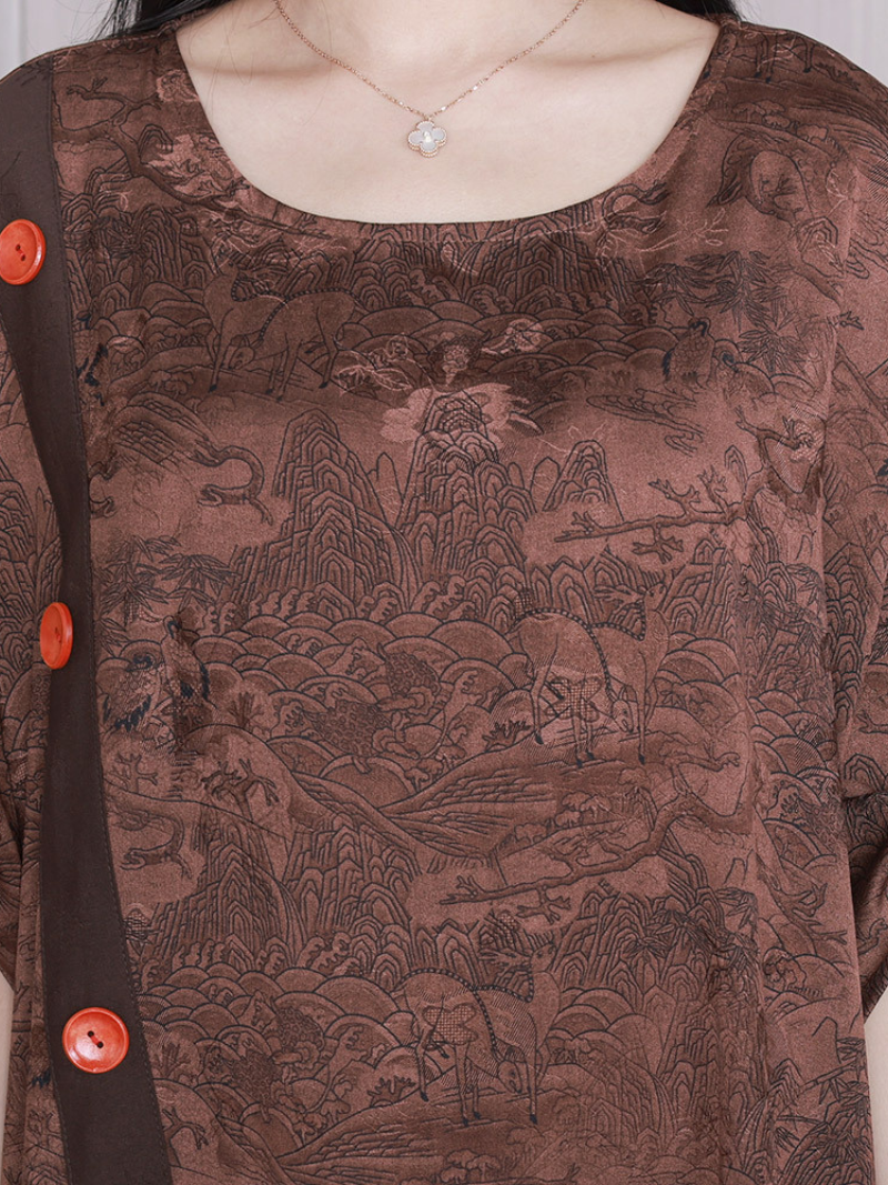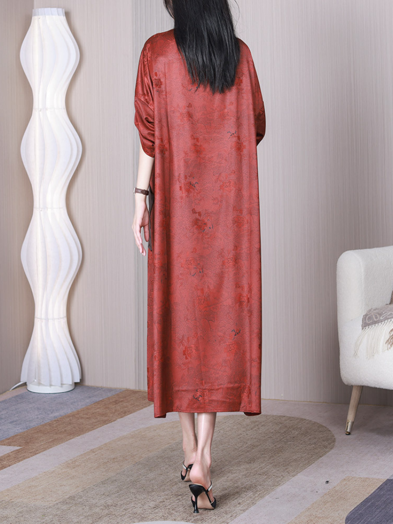 This beautiful silk A-line Dress is a must-have for any fashion-savvy individual. The blouse comes in two stunning colors. red and coffee. and features a round neckline and loose waist. providing both comfort and style. The blouse is adorned with a breathtaking landscape pattern. adding a touch of nature to the overall look. The dolman sleeves of the blouse provide a relaxed and comfortable fit. making it perfect for a variety of occasions. The luxurious silk material not only adds a touch of elegance to the blouse but also provides comfort and durability. This blouse can be dressed up with a skirt or dressed down with jeans. making it a versatile addition to any wardrobe. Its stunning colors and landscape pattern make it a must-have for any fashion-forward individual.