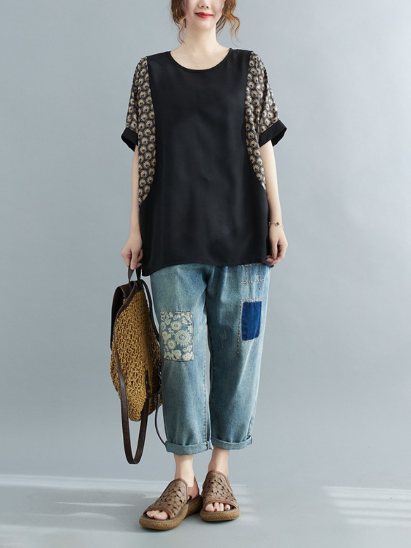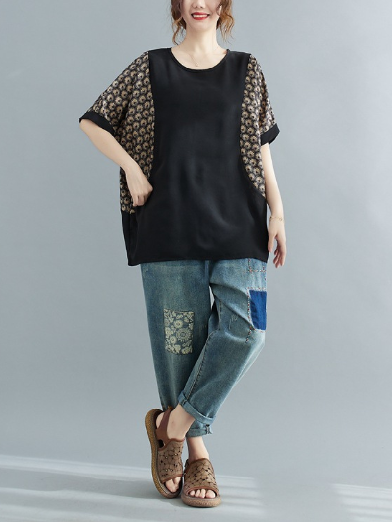 This loose-fitting pullover top is made from high-quality polyester material. providing a comfortable and breathable fit. The top comes in classic black color. making it easy to match with a variety of bottoms. It features a round neck design. which provides a comfortable fit for the wearer. The top has a trendy floral pattern. adding a touch of elegance and sophistication to the overall look. The loose fit of the top provides a relaxed and comfortable feel. making it perfect for everyday wear. The style of the top is pullover. making it easy to wear and remove. This top can be dressed up or down. depending on the occasion. making it a versatile addition to any wardrobe.