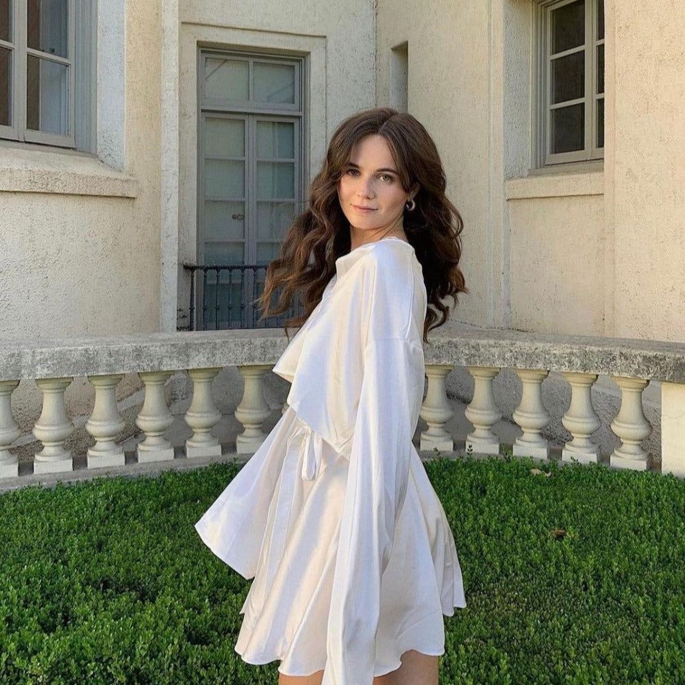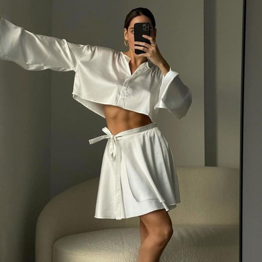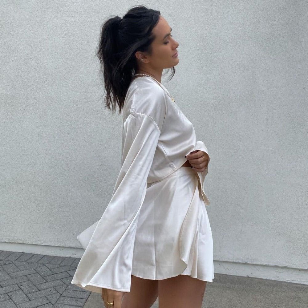 Love On The Horizons Button Front Satin Blouse & Self Belted Skirt Set
