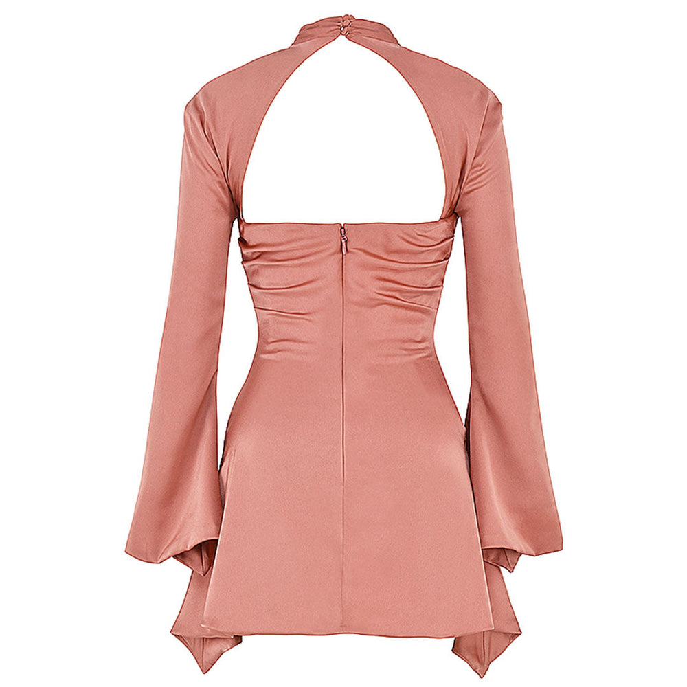 You can't miss this luxury & beautiful party mini dress this season. Made of polished satin and polyester. embellished with sexy bare cutouts at the chest and back. featuring a mock neckline trimmed with button closures. long sleeves with flared cuffs. a bodycon shape tailored with ruched details at sides and a hidden zip closure at back. and ended up with an asymmetric short length. Find more unique women's cocktail party dresses or trendy clothing in our boutique. and team with glittering earrings and sparkly butterfly stilettos for your upcoming romantic dinner date at night.