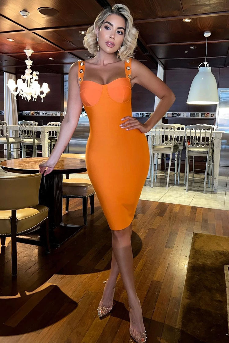 Bold. contrast. vintage and luxe. this kind of beautiful burnt orange dress is the style of the season whether for cocktail parties or dressed down for the day. Featuring a darling sweetheart neckline in an understated two-tone hue. metallic gold-tone buttons on the suspender shoulder straps creates a nostalgic vibe. the slightly stretchy bandage knit fabric hugging your shape in the right places. and this figure hugging silhouette with a hidden back zipper and a dramatic back slit in a mid-length dress cut. this stunning sleeveless midi dress in our boutique is another must-have for your wardrobe. Classy bandage dresses are the perfect trans-seasonal outfits for women. Team yours with high heels simply and bare legs on sunny days. or layer up when the cooler weather arrives.