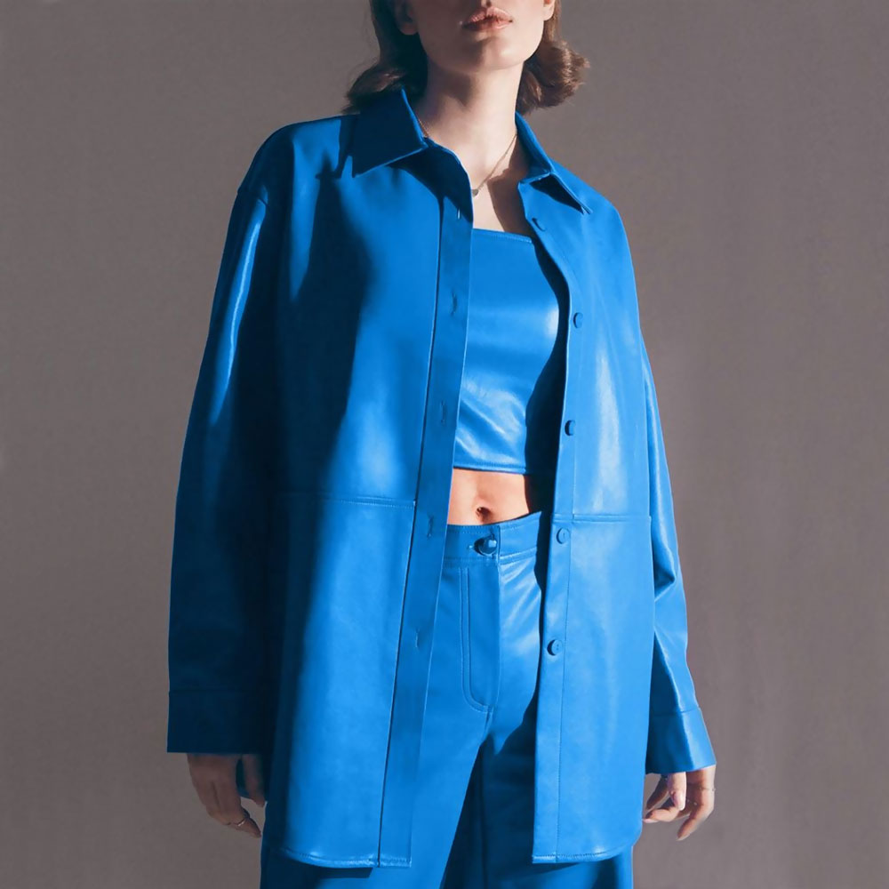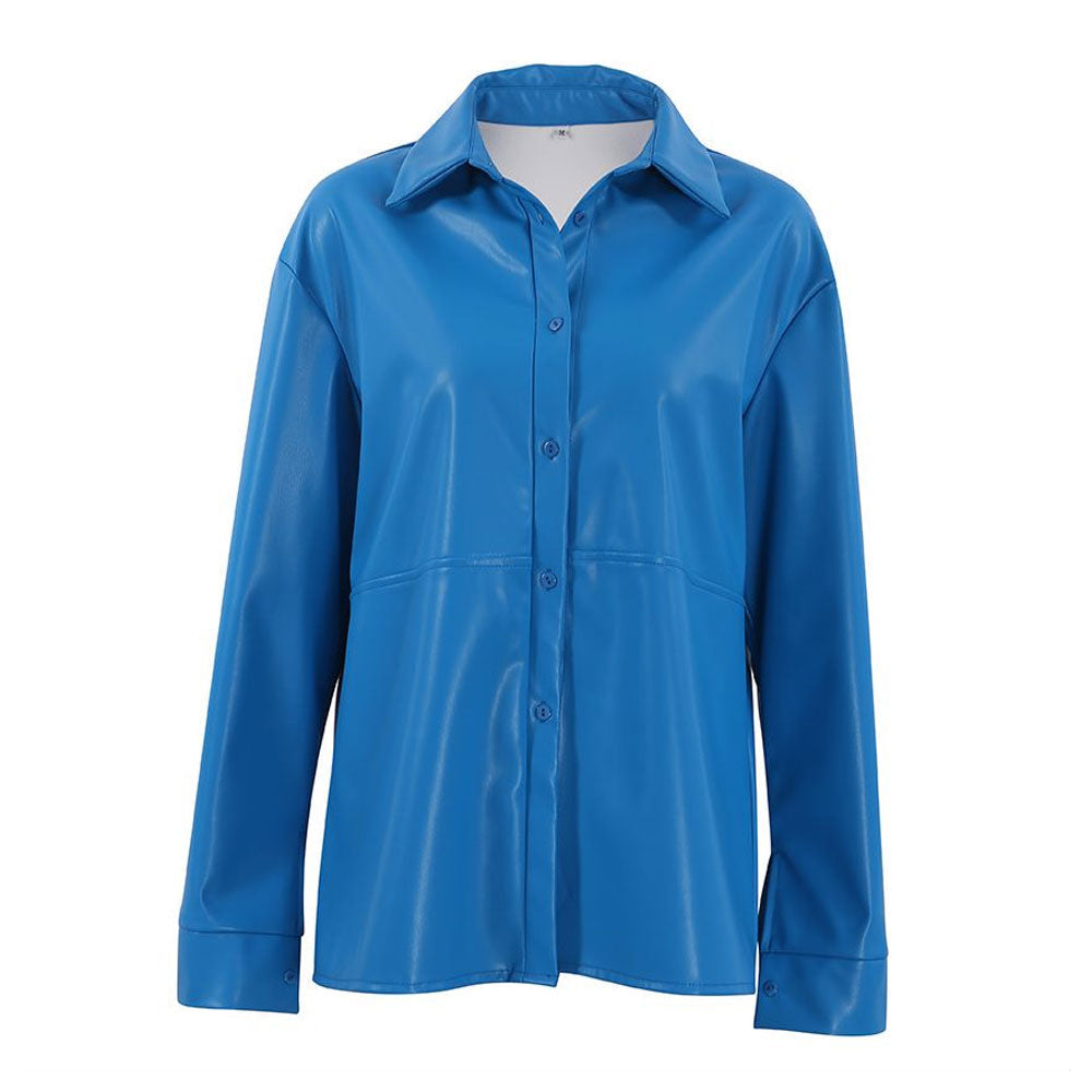 Be a stunning vision in everyone's eyes with this man-made leather shirt. Crafted with breathable PU leather. polyester and elastane. stand out in varnished solid color allover accented with seamed details. featuring a pointed collar neckline followed with a tonal buttoned placket. long sleeves trimmed with button closures. a relaxed silhouette structured with a slightly brushed lining. ending up in a slightly long length. Find more trendy women's vegan shirts or unique clothing in our boutique. and team it with a pair of leather ankle boots and leather pants.