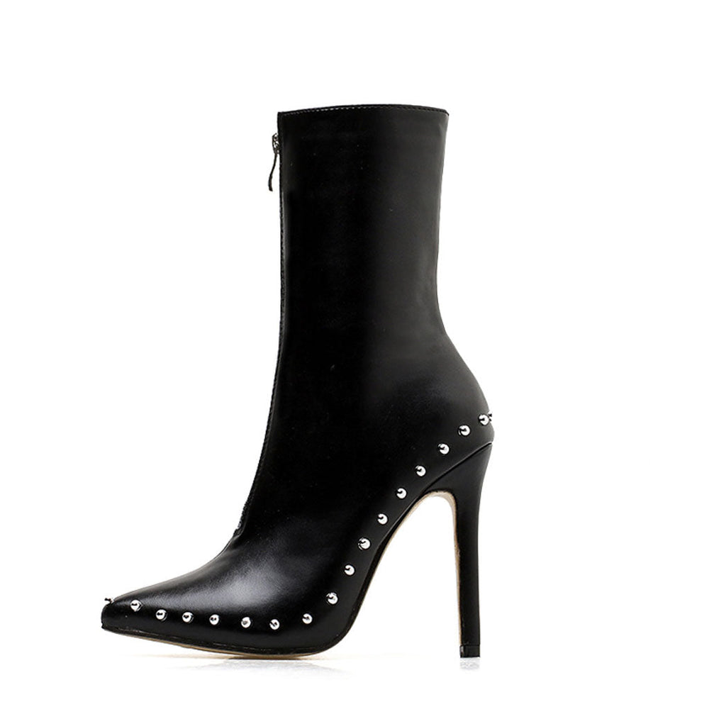 This black pair of ankle boots will not go out of style. Crafted with PU leather and rubber. embellished with metallic beads edge. featuring an ankle height top line. sharp pointed toes to the front. a zip fastening to the front. and stiletto heel soles along with rubber heel caps. Find more trendy women's ankle boots and unique shoes in our boutique. and wear yours with a pair of your skinny jeans when going out - Heel height: 11.5 cm.