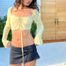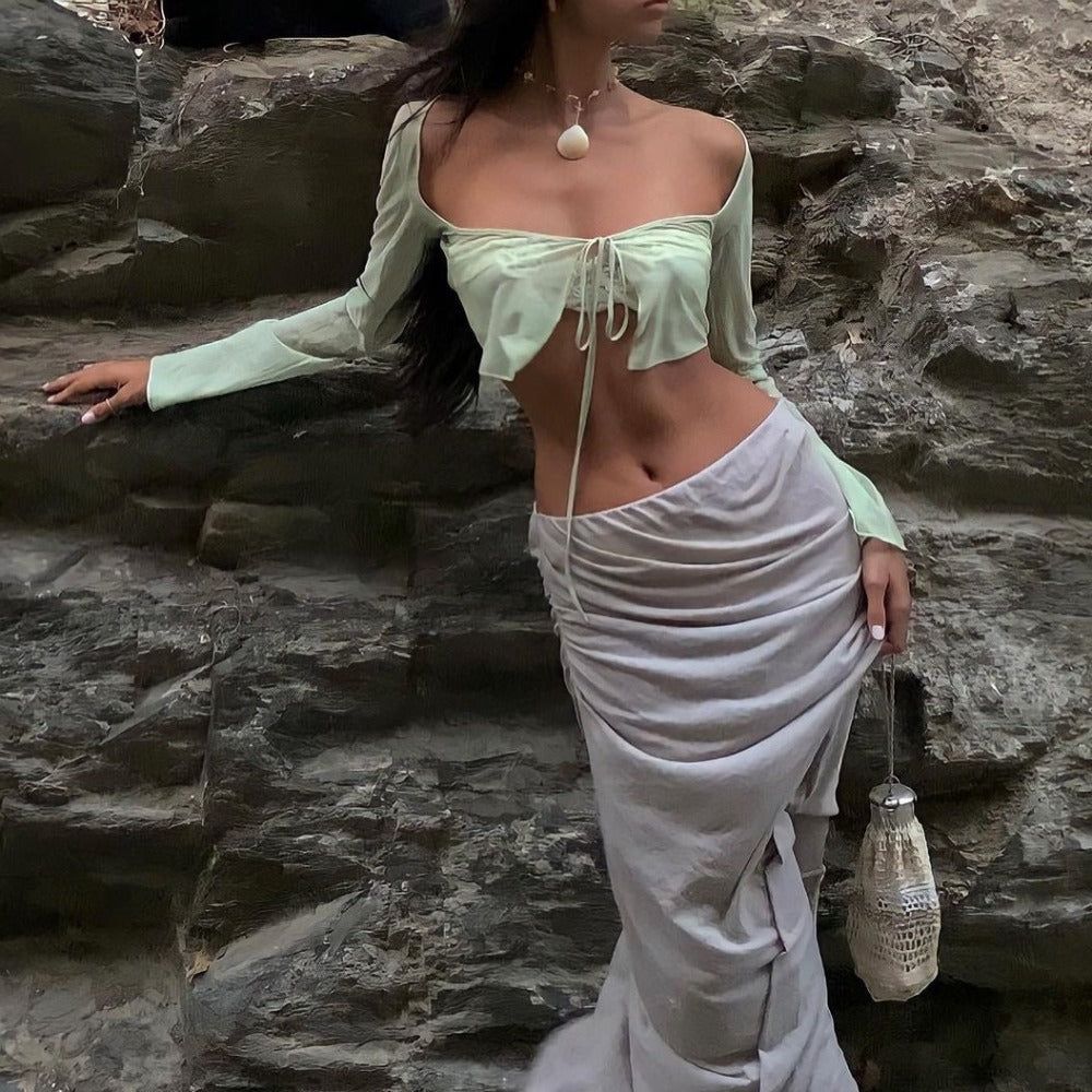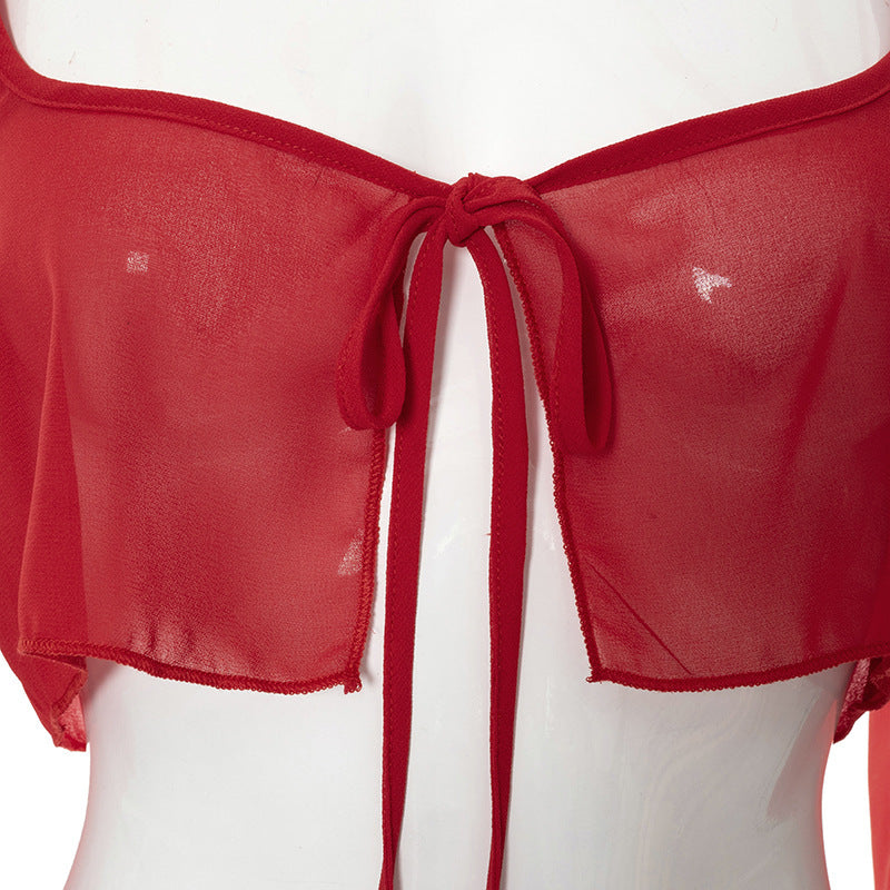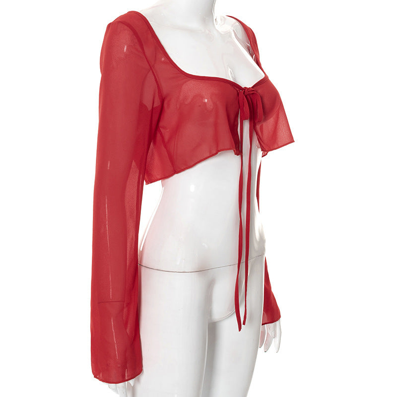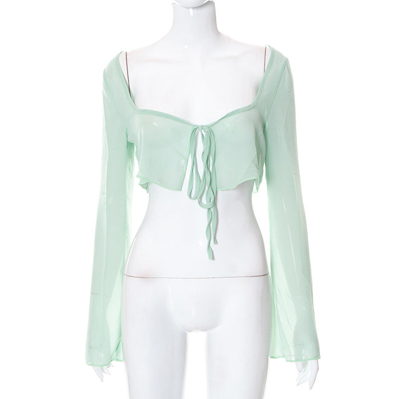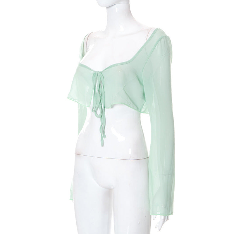 ï»?/em>Embrace the delicate beauty of the Morning Glory Chiffon Long Sleeve Crop Top from Fiel Shop. This ethereal piece captures the essence of femininity and grace with its flowy chiffon fabric and intricate details. The long sleeves add an elegant touch. while the crop length brings a hint of playfulness to the design. Crafted with meticulous attention to detail and using high-quality materials. this crop top ensures both comfort and style. Whether you're attending a garden party or looking to add a romantic touch to your everyday look. the Morning Glory Chiffon Long Sleeve Crop Top is the perfect choice. Embrace the enchantment and let this top become a cherished piece in your wardrobe. allowing you to blossom with beauty and charm.