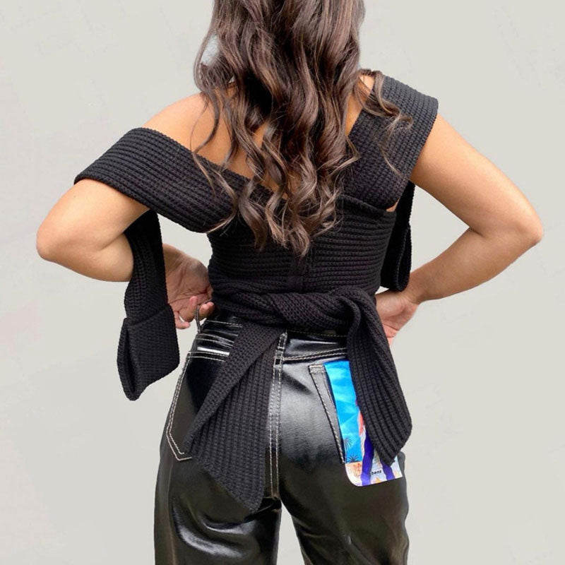 There are many ways to tie the straps of this crop knitted top. Crafted with soft jersey fabric and polyester in solid color. embellished with versatile multi ways. featuring a bandage-style cut structured with four suspender straps wrap-around and a cropped length. Find more unique women's knit tops or trendy clothing in our boutique. and wear it on its own now and under an oversize blazer later.