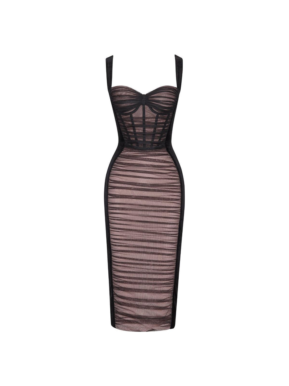 Keep this fierce with this Muriel Mesh Ruched Velvet Midi Dress In Black. Featuring a wine mesh material with a sweetheart. team it with some strappy heels and a mini bag to finish off the weekend worthy look.