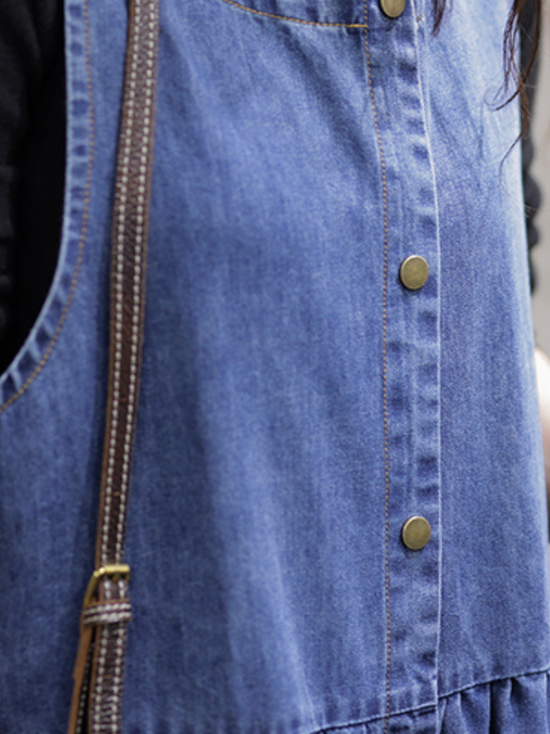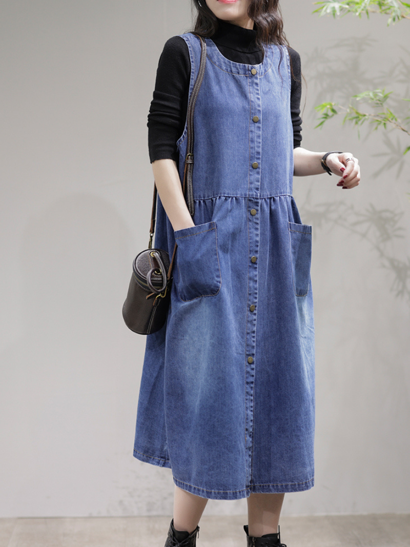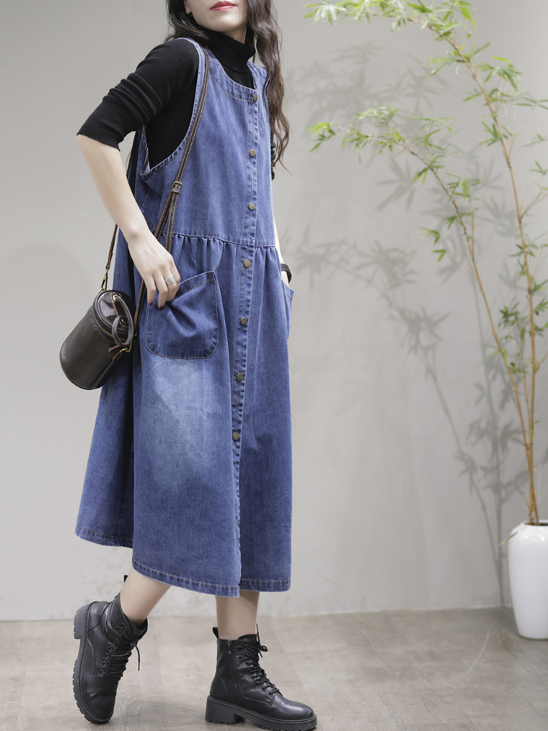 A women's casual high waist round neck denim dress is a stylish and versatile piece of clothing that is suitable for a wide range of occasions. The dress is made from durable and comfortable denim fabric. featuring a high waistline that accentuates the figure and creates the appearance of longer legs. The round neckline adds a classic and timeless touch to the dress. while the overall design is both functional and fashionable. providing a comfortable fit and ease of movement.Overall. women's casual high waist round neck denim dresses are a must-have staple in any wardrobe. providing both style and comfort.