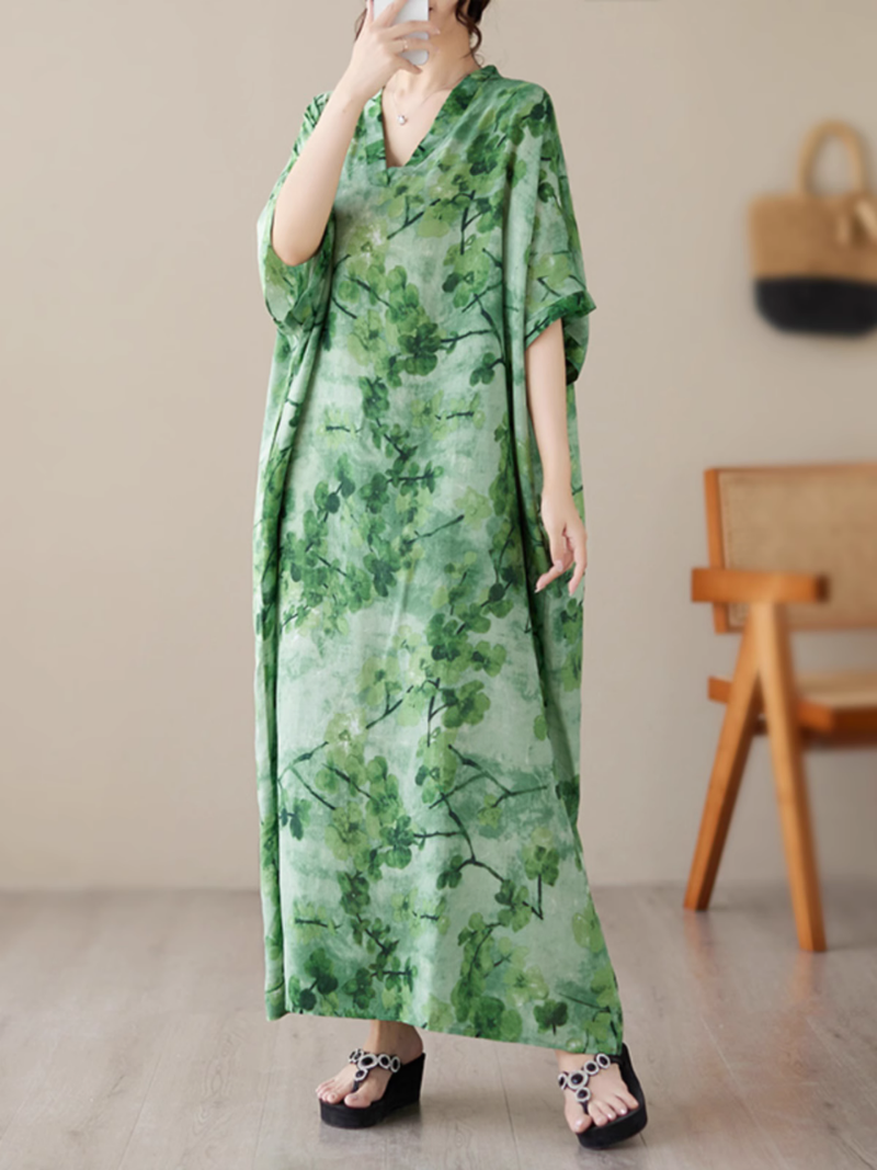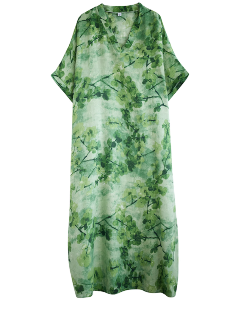 Indulge in the ultimate comfort and style with our Women's Loose Kaftan Dress. a perfect blend of casual and chic. Crafted from a luxurious combination of cotton and flax. this dress offers a soft and breathable feel. making it perfect for any occasion. The V neck collar adds a touch of elegance. while the bat sleeve design brings a relaxed and flowy vibe. The Free Size ensures a comfortable fit. with a bust circumference of 158cm and a length of 133cm. Whether you're lounging at home or heading out for a casual gathering. this loose kaftan dress is the epitome of effortless fashion.