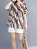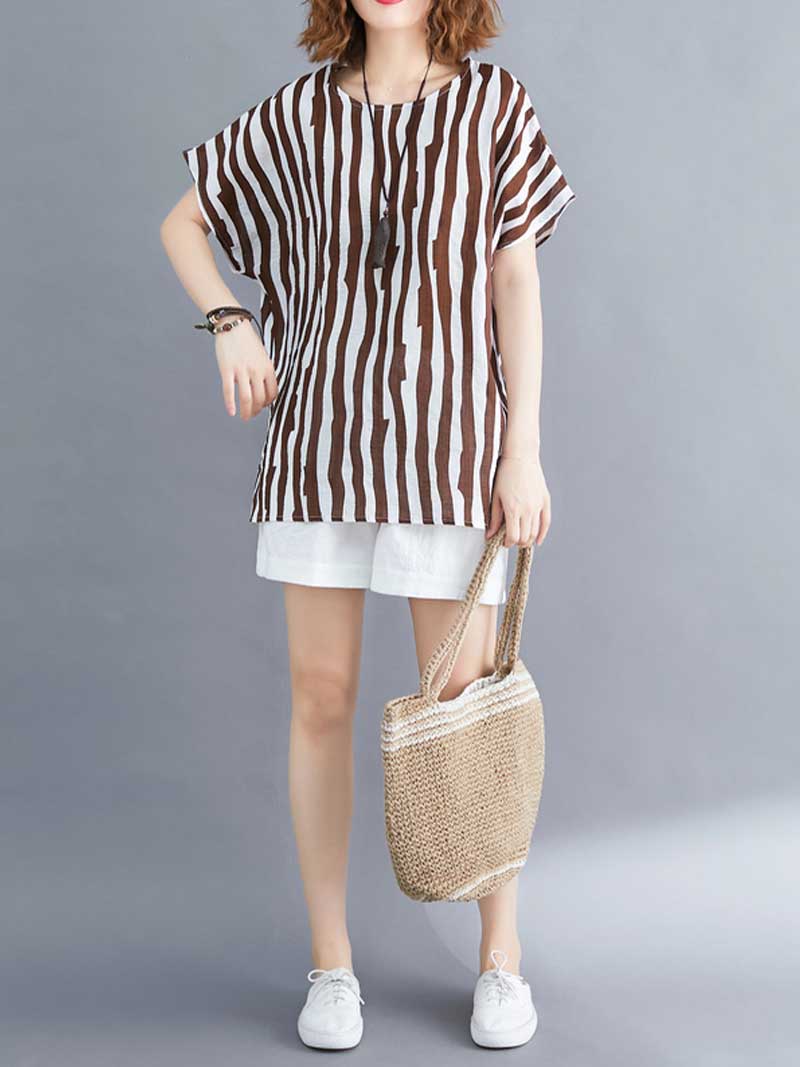 This top is made of cotton and linen. which makes it thin and breathable. It has a feminine round neck and short sleeves. The stripes give it a playful touch. while the coffee color makes it perfect for autumn wear.