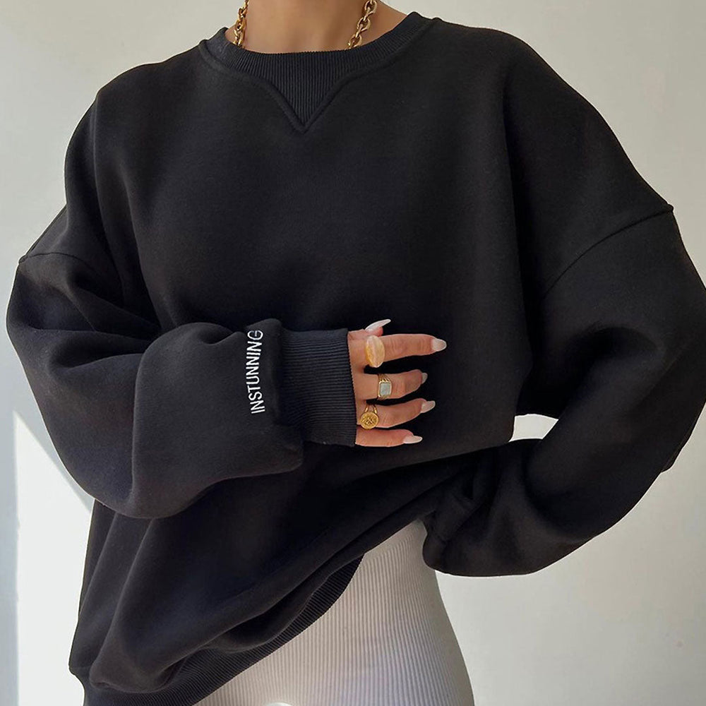 Keep it looking leisure and minimalist with this solid-color sweatshirt! Crafted with snug polyester and elastane. stand out in a loose fitting outlined with ribbed accents. featuring a crew neckline along with a curved seamed design. dropped shoulders framed with covered elastic cuffs and embroidered with contrasting embroidered letters. slightly fleeced lining. a slip-on styling with a slightly long length. Find more trendy women's brushed sweatshirts or unique clothing in our boutique. and style it with a pair of skinny pants.