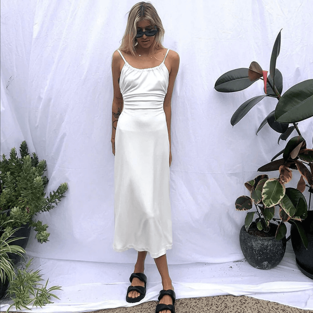 Crafted from smooth satin. embellished with a sultry open back with a drawstring tie. featuring a casual silhouette with a ruched scoop neck. sexy cut-out wraparound the waist trimmed with subtle ruching detailing at the front. and ended up with a graceful tea length.