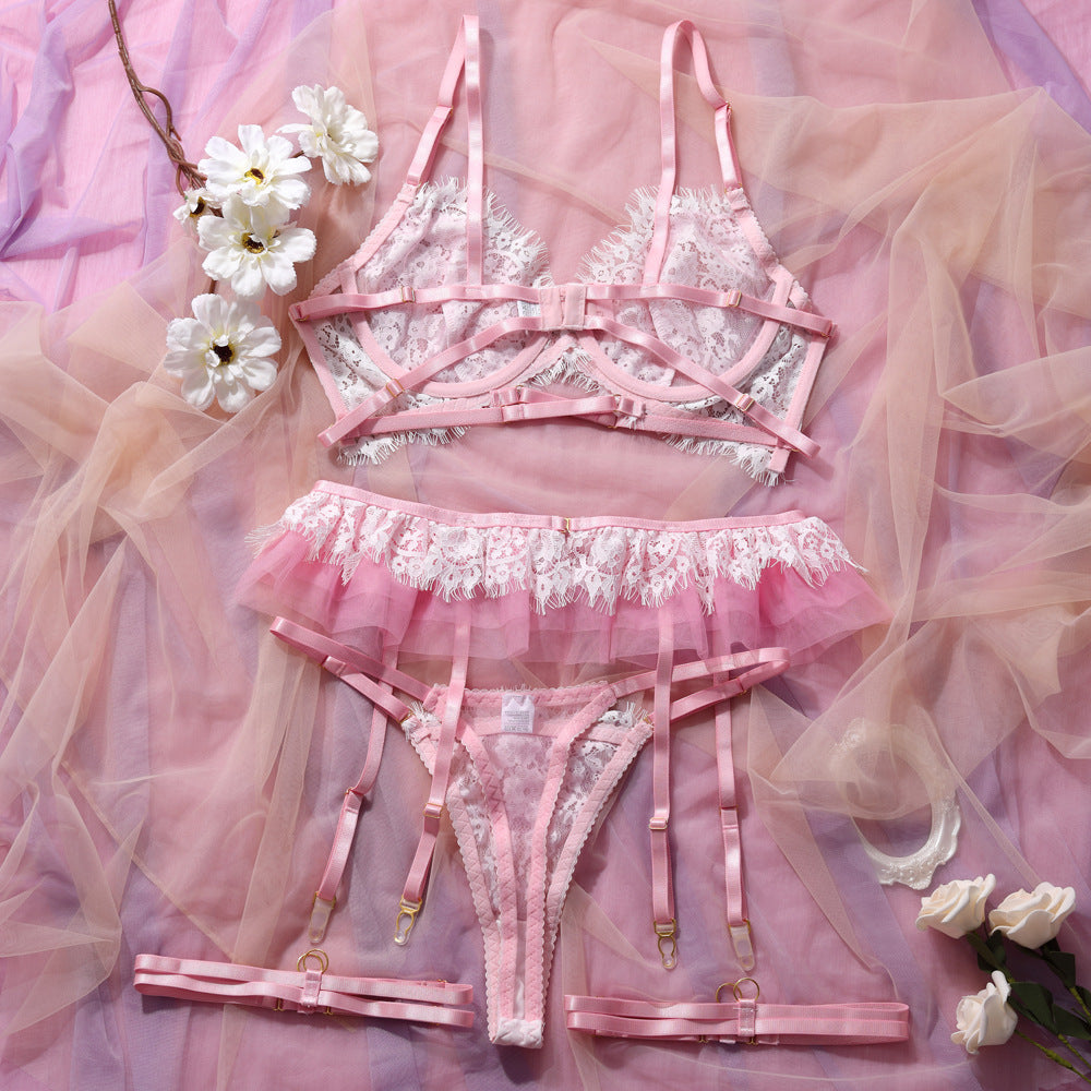 This Pink 3Pcs Color Block Lace Bralette Lingerie Set is the perfect addition to any lingerie collection.