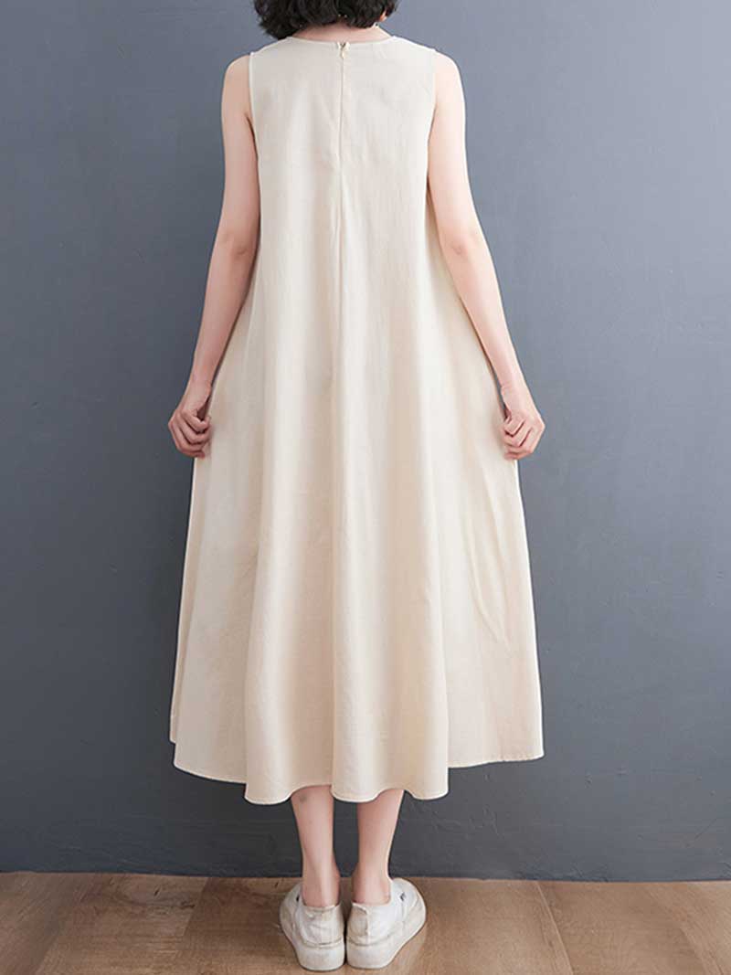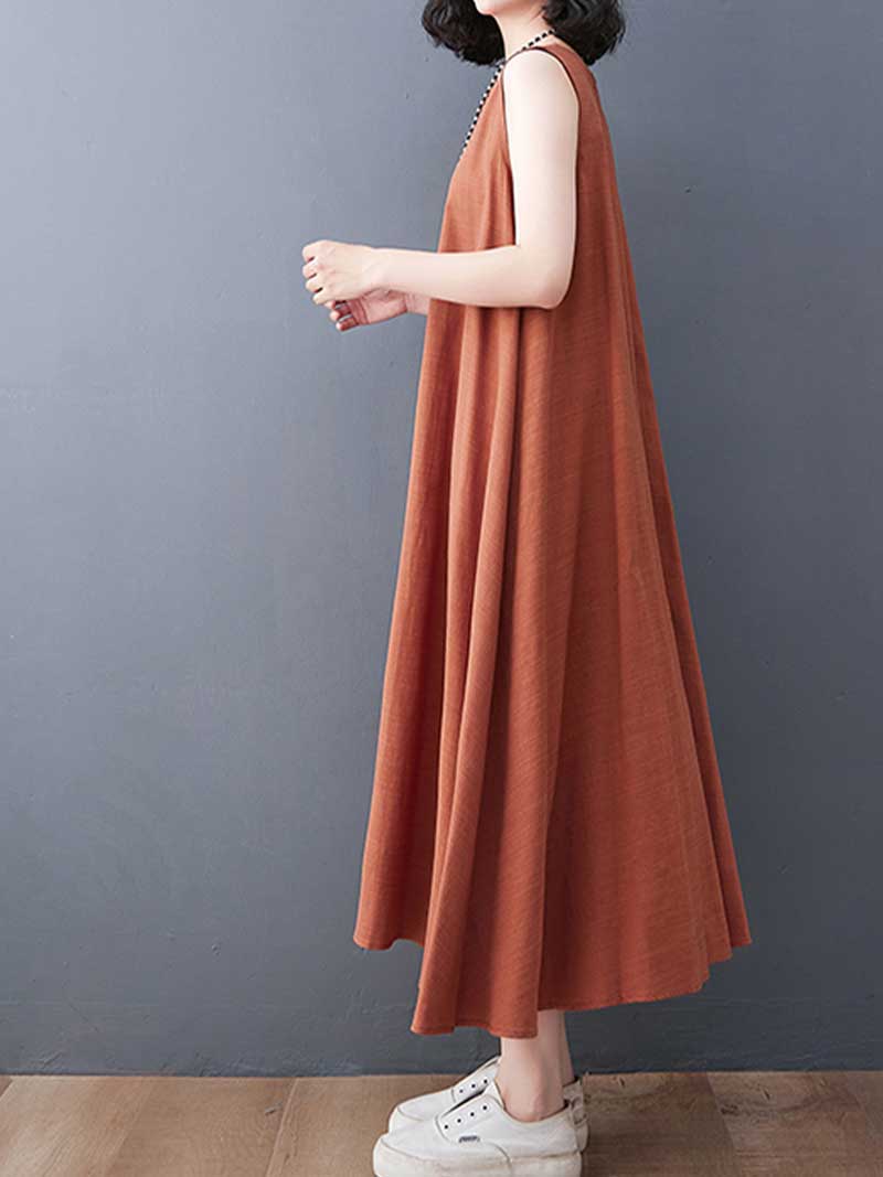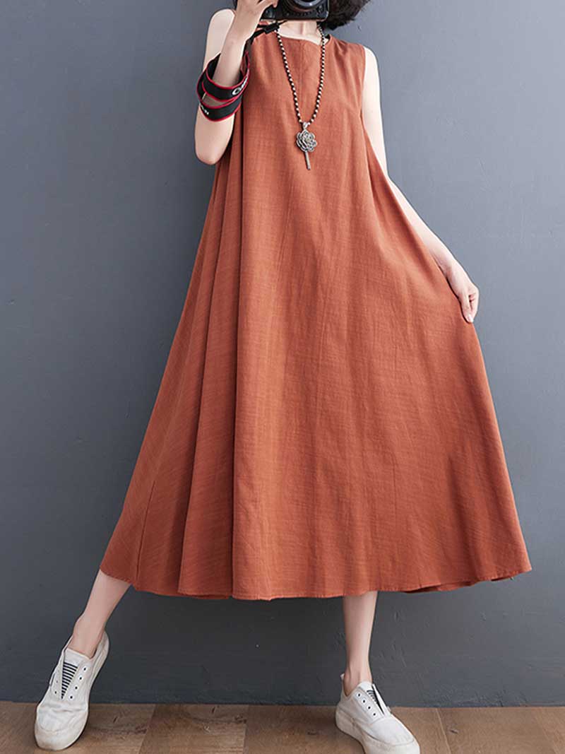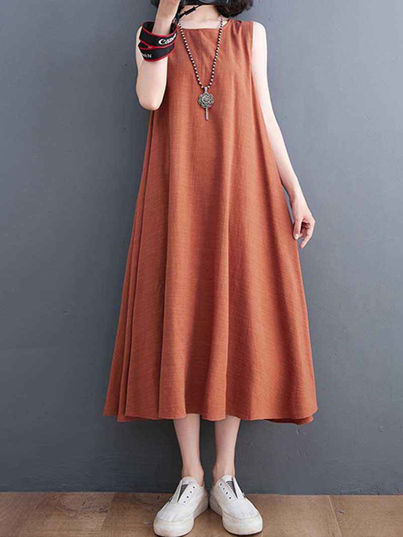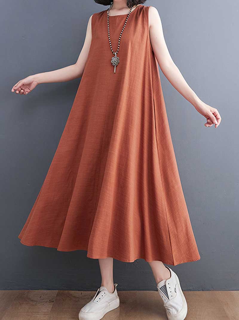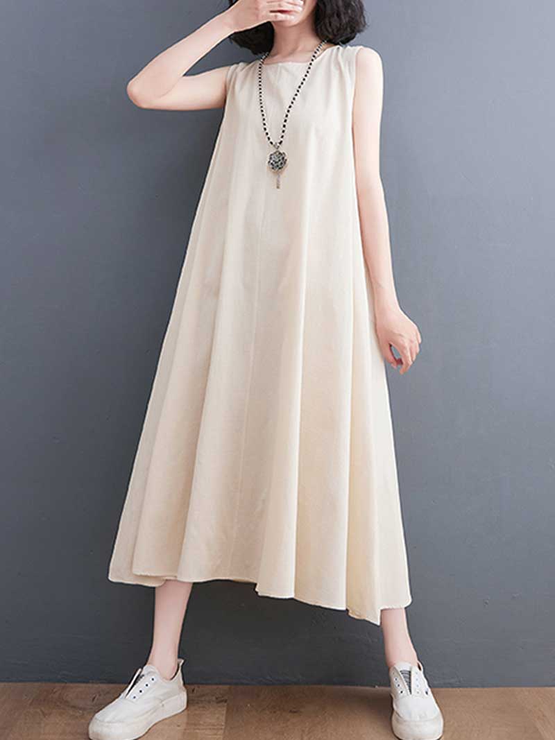 Looking for a pretty and comfortable summer dress? Look no further than this Plain Cotton Round Neck Sleeveless Midi Dress. Made from soft and lightweight cotton. it's perfect for hot summer days. The round neck and sleeveless design keeps you cool and comfortable. while the large swing skirt is perfect for twirling around in. Plus. it comes in two great summer colors - white and brown. So grab one before they're all gone! Size Detail:
