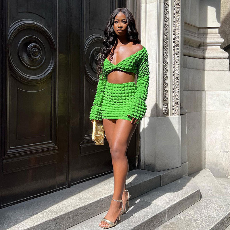 If you ever feel like giving up on your wardrobe. you don't need to worry since you now have this checkered matching set. Crafted with polyester and elastane. stand out in ruching gingham patterns embodied with dimensional jacquard all over. featuring a v neck followed with a twisted design at the front. long sleeves blanketed with bubble-like trimmings and gently flared cuffs. and complete a two piece textured matching set with a mini skirt. an elastic waist accentuated with a lettuce-edged hemline. a bodycon skirt silhouette finished with a short length. Find more trendy women's long-sleeve skirt matching sets or unique clothing in our boutique. and wear it with a pair of combat boots for a mesmerizing look.