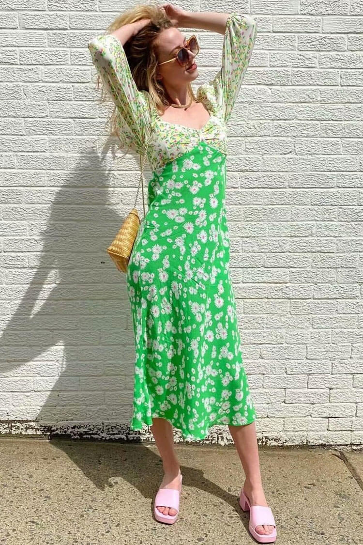 Add some colors to your fall & winter wardrobe with cottagecore smock dresses. This fresh and summery puff sleeve ditsy floral printed midi dress is a no-brainer for women. Designed with a V neckline with a bowknot shape and a shirred back. 3/4 puff sleeves with elasticated cuffs. slip-on styling. a relaxed silhouette in two-tone flower patchworks. and a mid-length dress cut. this countryside style smock midi dress in our boutique exudes a feeling of living in a relaxing countryside while you are in the garden party. Style it with funny accessories and strappy sandals to complete a cute outfit.