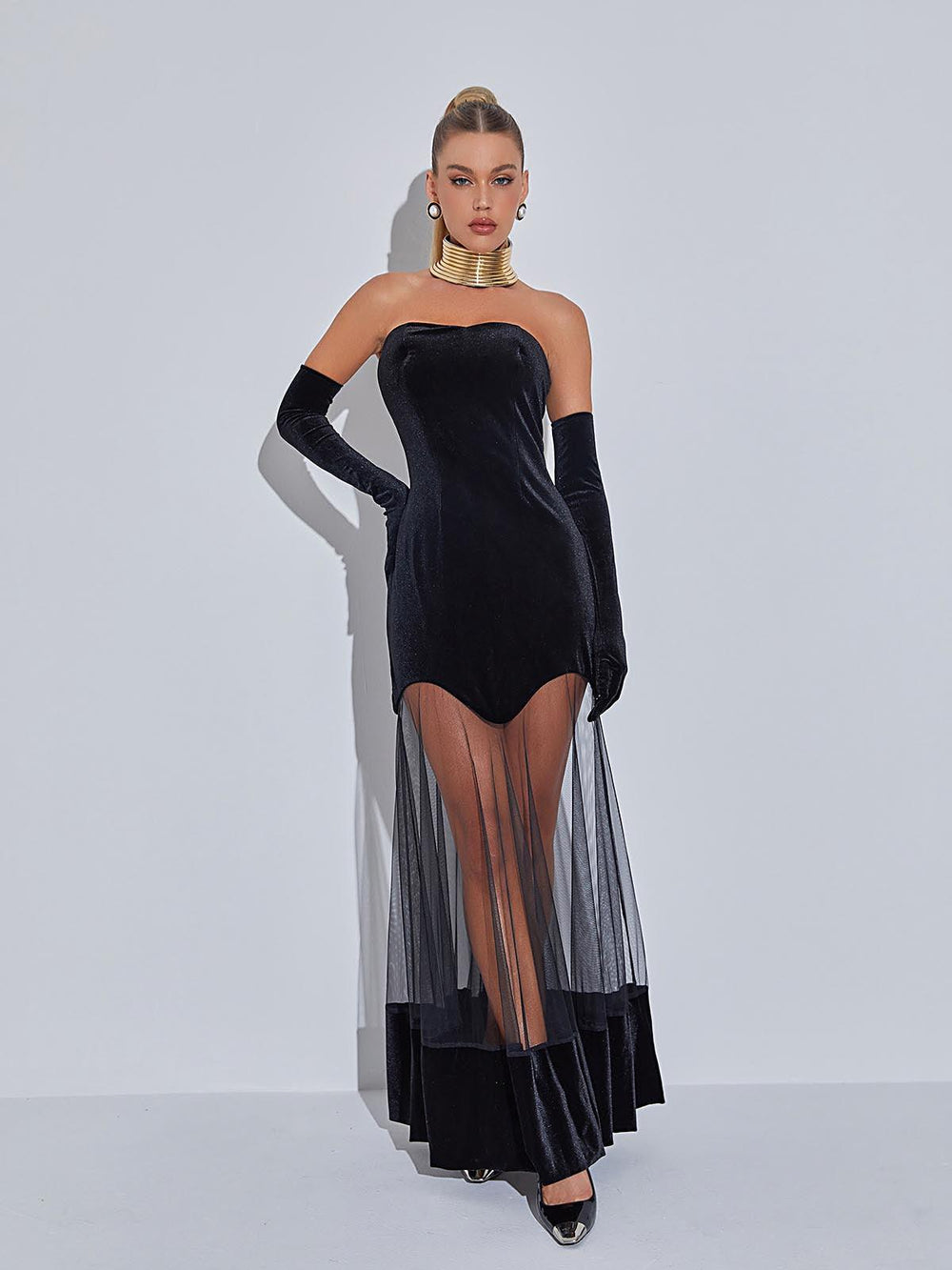 All eyes on you in our Rena Strapless Velvet Mesh Maxi Dress. Featuring a strapless design and a see through detail in the bottom. Perfect for the holidays. Embraces your curves. Add some strappy heels to complete this look.