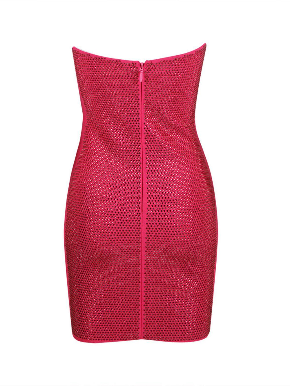 Add a touch of sparkle to your look with this Rheya Strapless Bandage Dress In Hot Pink. Crafted from bandage fabric and adorned with rhinestones. this mini-length strapless dress radiates effortless glamour. Perfect for an evening out. you'll always make a statement with this timeless piece.