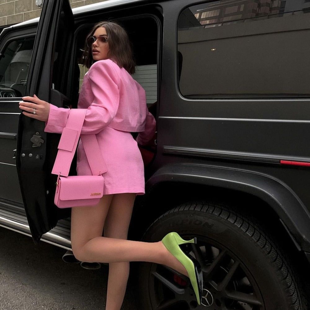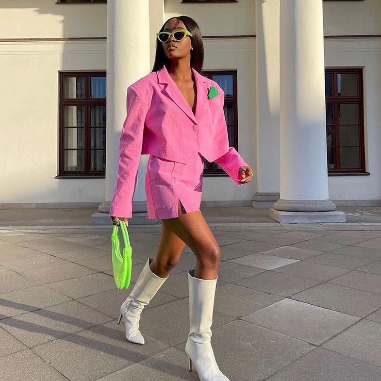Make a bold statement with the Romeo Cropped Blazer and Slit Mini Skirt Set from Fiel Shop. This set combines sophistication with a touch of edginess. perfect for those who want to stand out from the crowd. The cropped blazer features a tailored fit and a unique cutout design at the back. adding a contemporary twist to a classic silhouette. The matching mini skirt boasts a daring front slit. allowing you to show off your legs and add a flirty touch to your outfit. Crafted from a high-quality fabric blend. this set offers both comfort and style. Whether you're attending a special event. going out for a night on the town. or want to make a fashion-forward statement. the Romeo set is the perfect choice. Pair it with heels and statement accessories for a glamorous and head-turning ensemble. Embrace your inner fashionista and let the Romeo Cropped Blazer and Slit Mini Skirt Set be your go-to option for creating chic and unforgettable looks. Unleash your confidence and make a stylish impact with this stunning set.