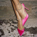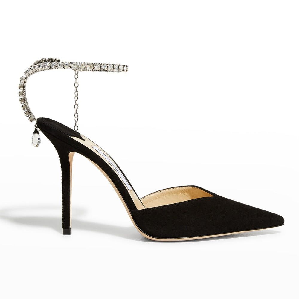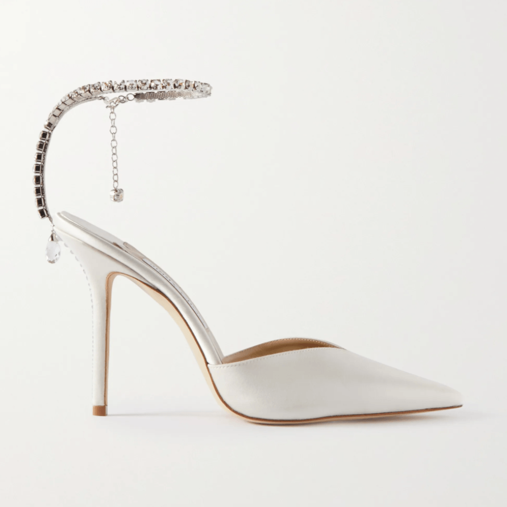 Blurring the lines between shoes and jewellery. our Rosemary Heels in soft satin are true showstoppers. This pair is decorated with a delicate crystal chain that suspends a single crystal and gently adorns the ankle like jewellery. The meticulously crafted crystals also drip gracefully down the line of the heel. Striking and statement. this pointed pair is set on a slim 3.5 in heel. A truly exquisite masterpiece.
