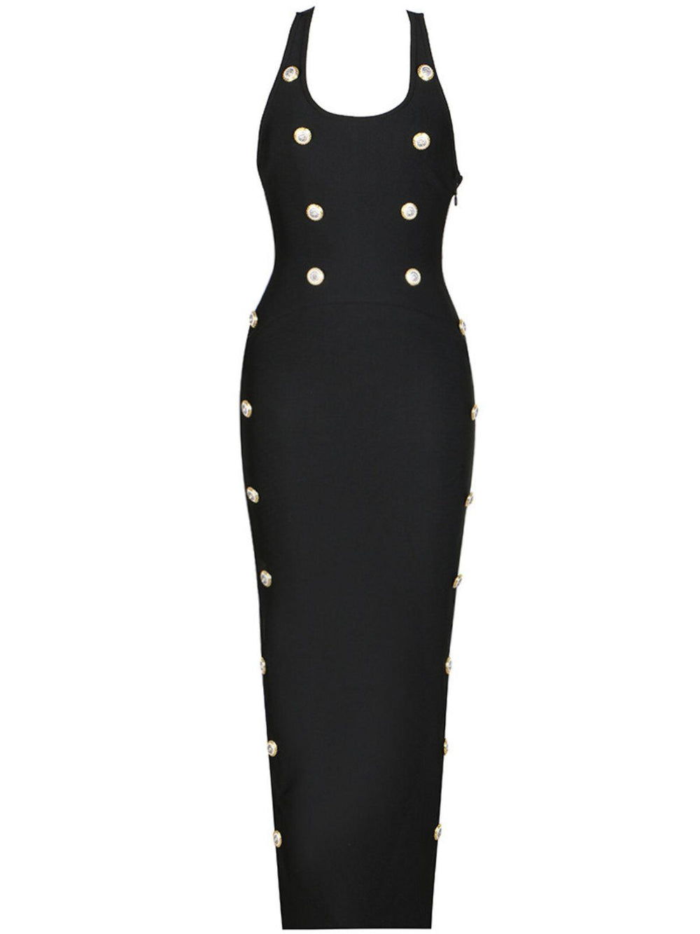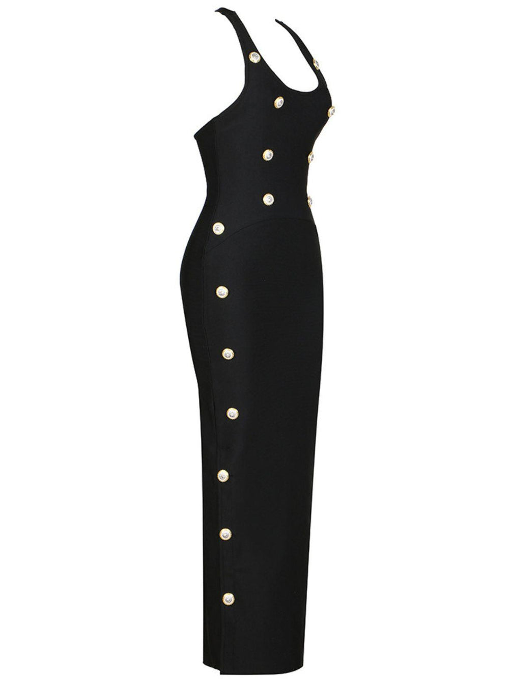 Be stately and elegant with the Sadie Button Embellished FielShop Dress. Its FielShop fabric is designed to hug all your curves while the subtle split adds femininity and extra movement. Complete with a maxi length. bring a touch of sophistication to any special occasion.