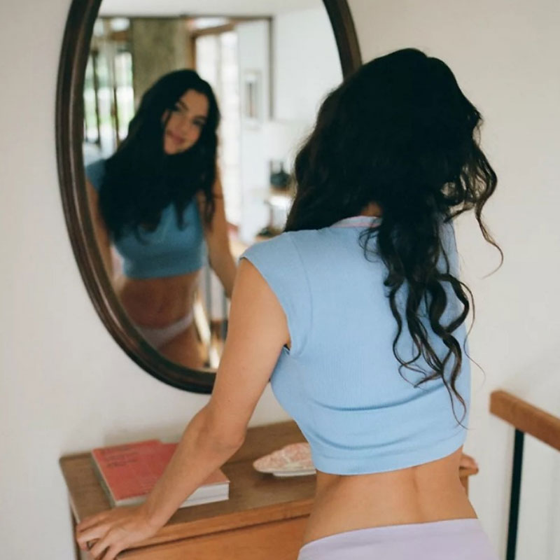 Twirl under the summer sun in this easy-breezy short sleeve top. Made of cotton blend. stand out in seamed stitching details. featuring a chic neckline along with contrasting charms. a fitted silhouette framed with short sleeves. ribbed textures allover. ending up with a cropped length. Find more trendy women's ribbed tops or unique clothing in our boutique. and wear it with a high-waist mini skirt for a cute yet flirty look.