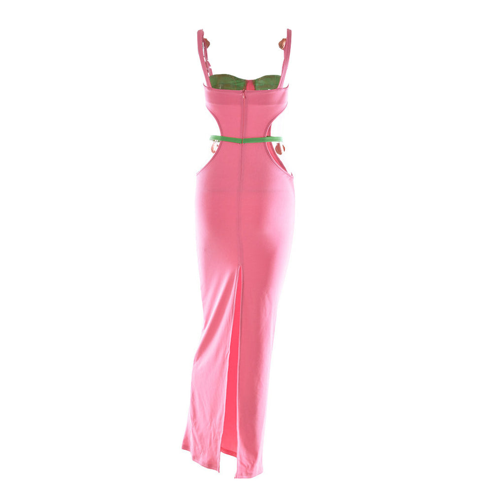 Looking to create a trendy look that will make a statement at your next prom event? Our contrast color maxi dress is just what you need! With bold cutout detailing at the side waist and metal shell embellishments on the shoulder straps and waistband. this dress is both edgy and elegant. The split back hem and concealed zipper at the middle back ensure a flattering and comfortable fit. Please note that the dress does not come with lining and may be semi-sheer in strong light. We recommend wearing seamless lightweight nude shorts underneath for maximum comfort and confidence. To craft a stylish and fashionable ensemble. browse our unique boutique and choose from a range of high heels. Turn heads and feel confident while creating a trendy look in this stunning dress!
