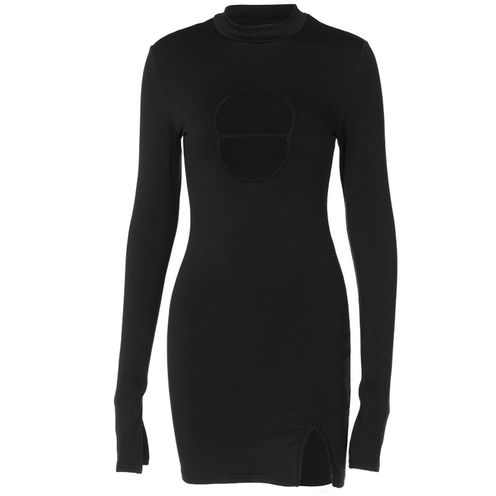 how off your curves with this flirty little black dress! Crafted with blend polyester. stand out in a hollow-out design with a strap. featuring a mock neckline. long sleeves tailored with split cuffs. a bodycon profile with a side slit detail. and a pullover styling ended up with a short length. Find more trendy women's party dresses or unique clothing in our boutique. and wear this sleeved dress with a pair of high-heel sandals to finish your look this autumn!